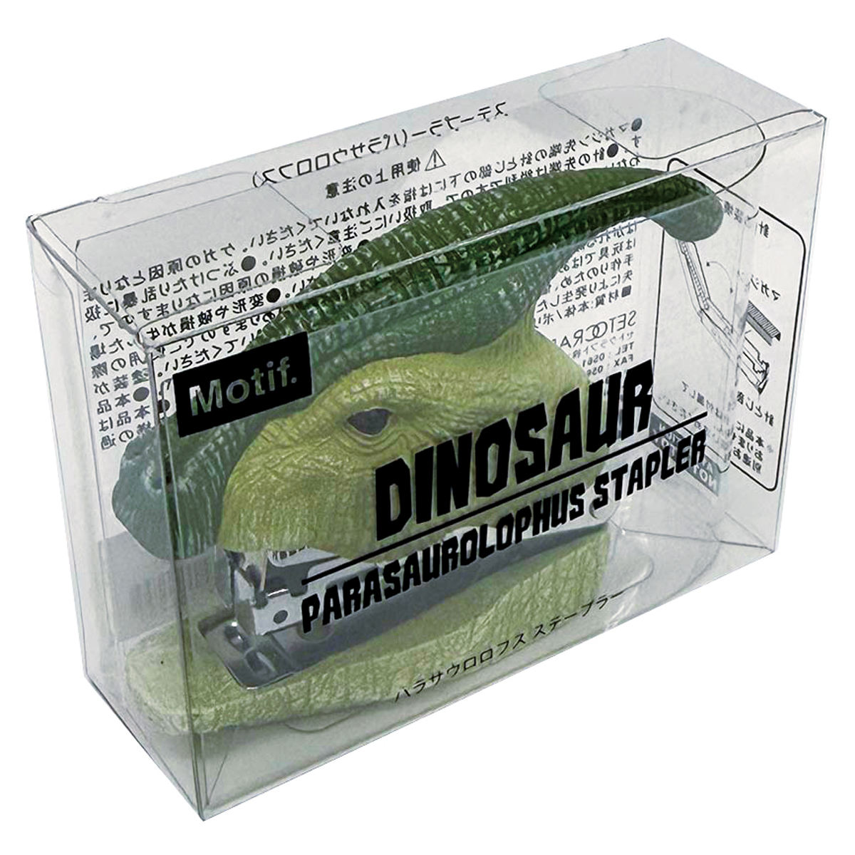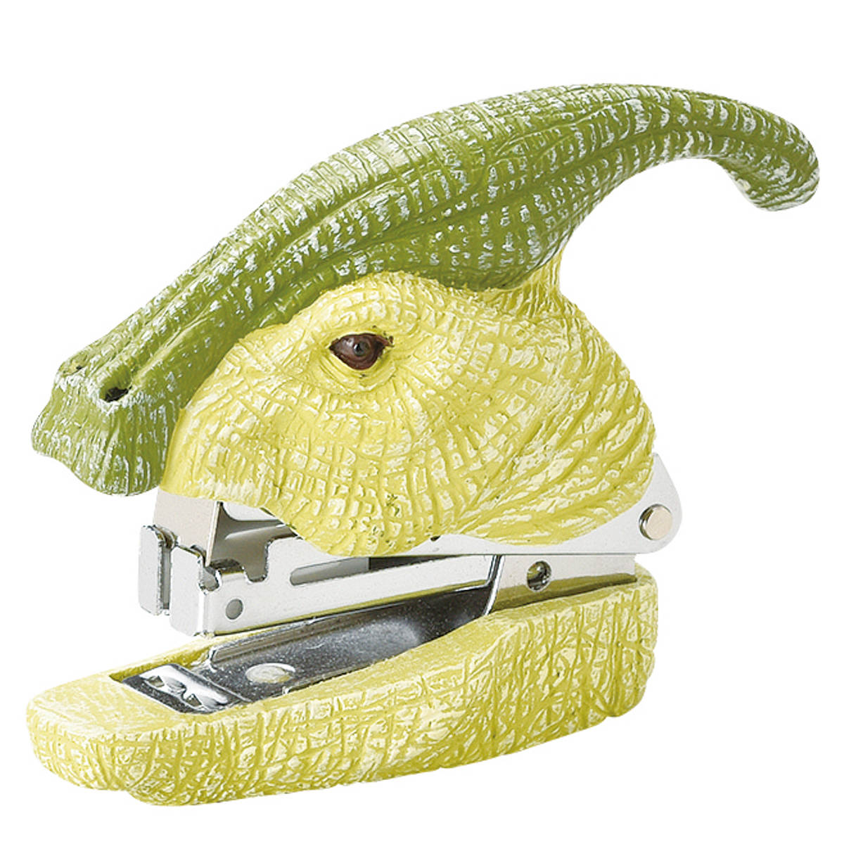 草食恐竜・パラサウロロフスの頭部をモチーフにしたインパクト抜群のステープラーです。リアルな造形がデスクの上でも存在感を放ち、個性的なインテリアとしても楽しめます。