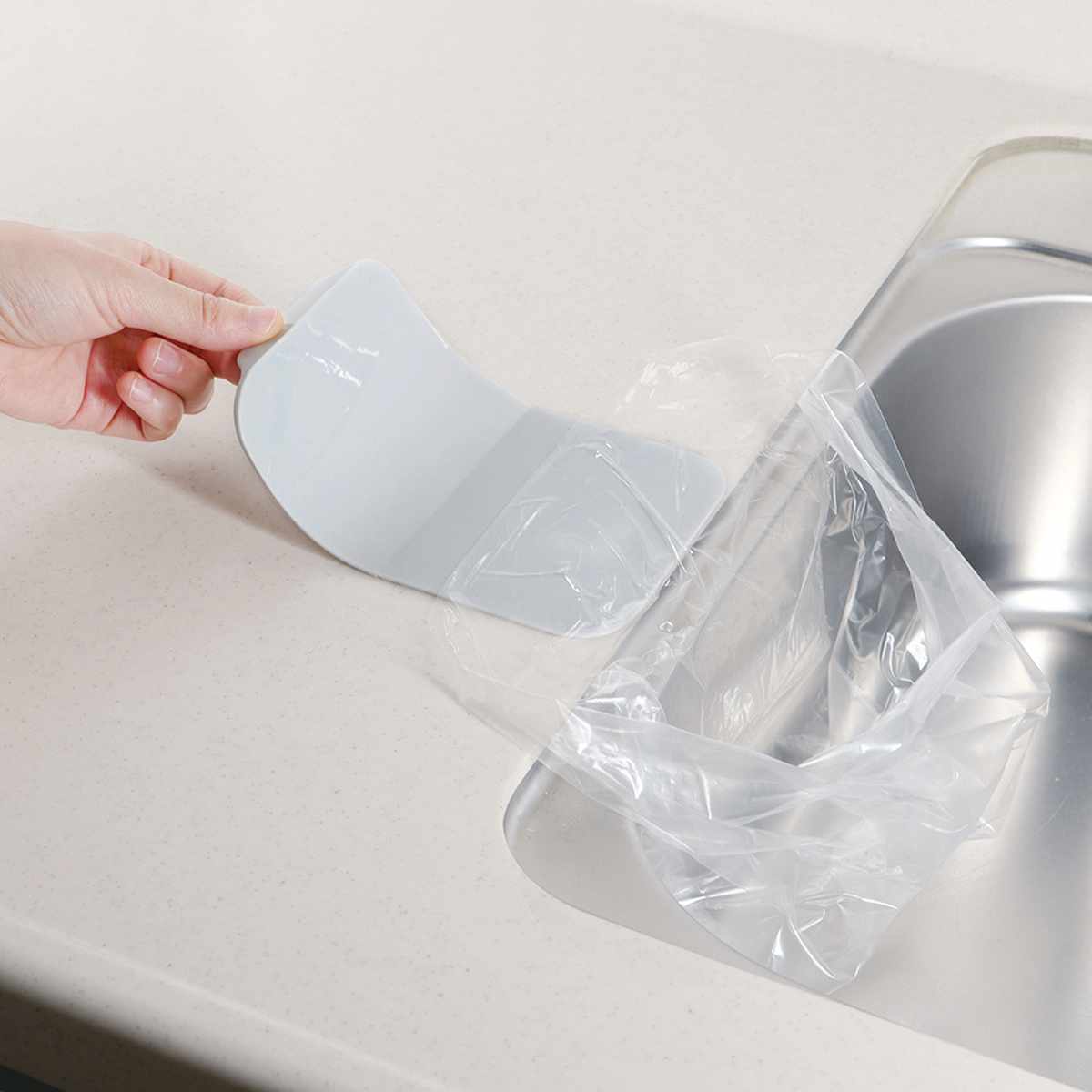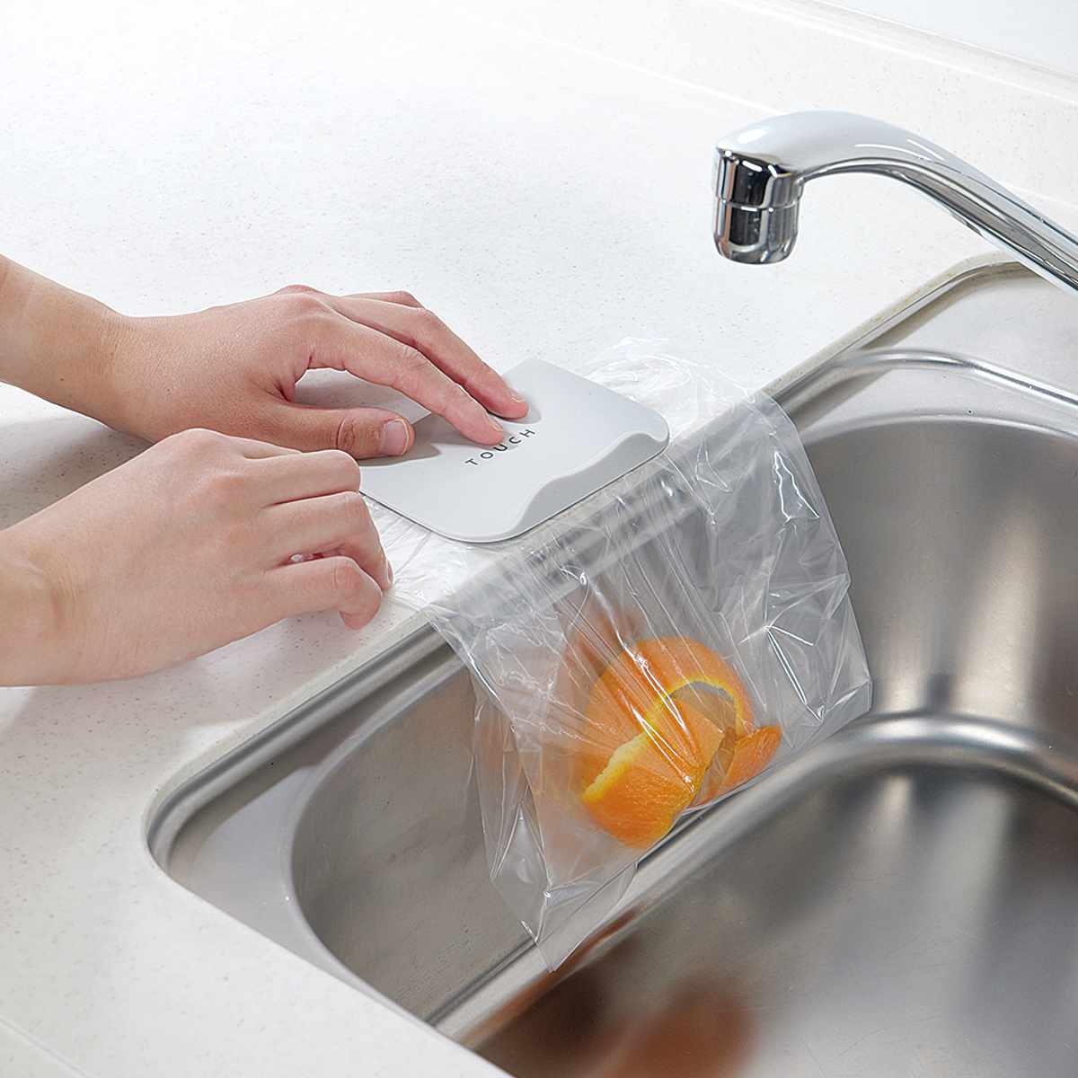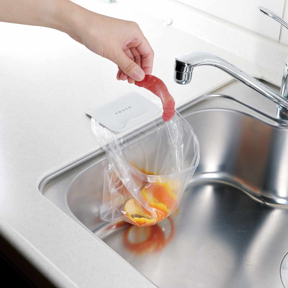 ペタッとくっつくゴミ入れです。シンクに貼り付けて、ポリ袋をはさむだけで簡単にセットでき、三角コーナーの代わりとしても手軽に使えます。