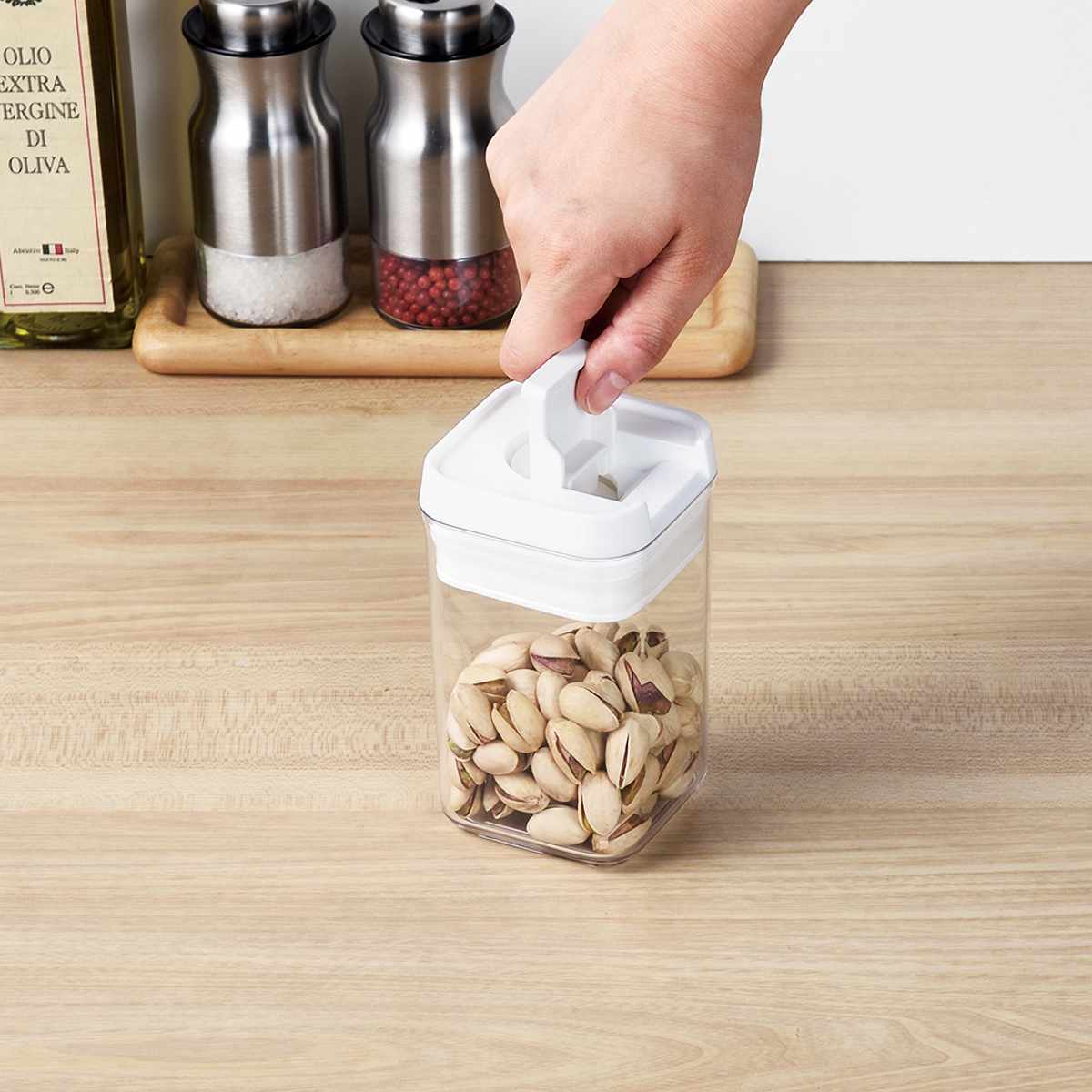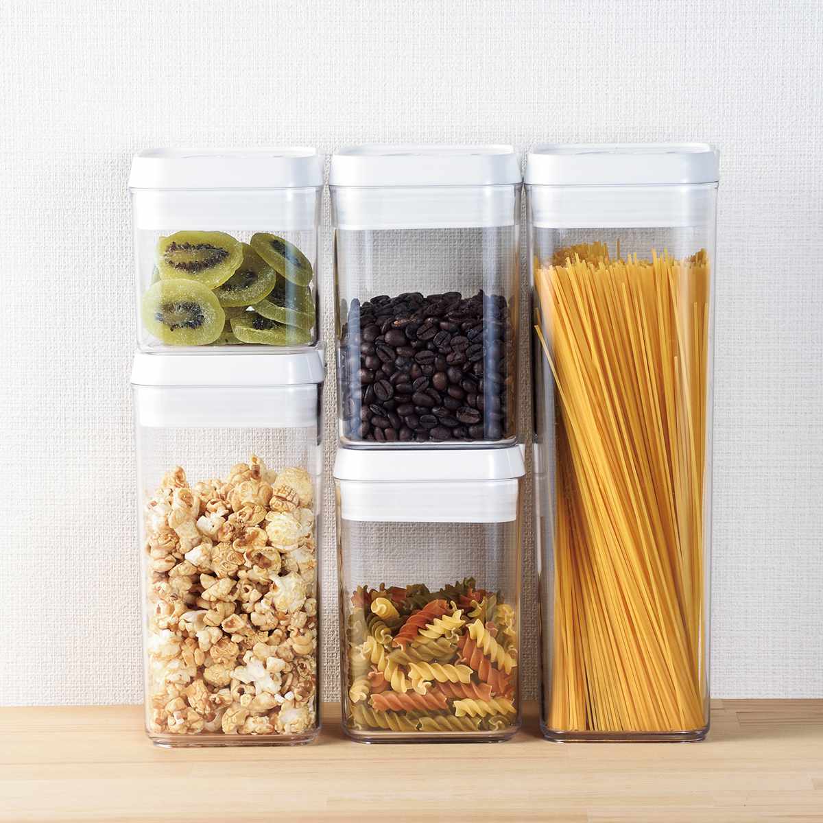 食材の保存に便利なレバーコンテナです。片手で簡単に開閉できるので、調理やストックもスムーズに行えます。