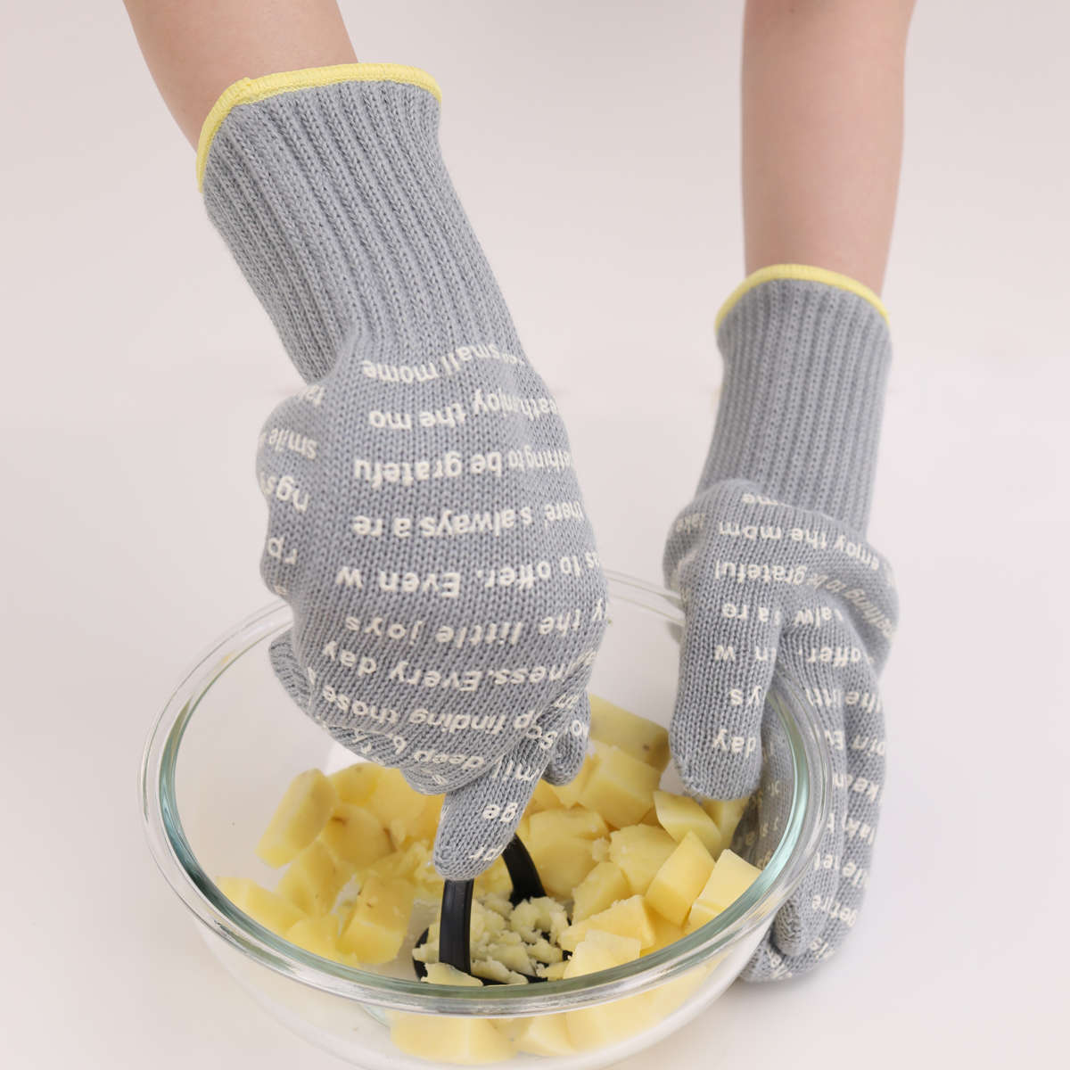 親指と人差し指が分かれていることで、指先に力を入れやすく、しっかり握れます。重い鍋や天板も安心して持てます。