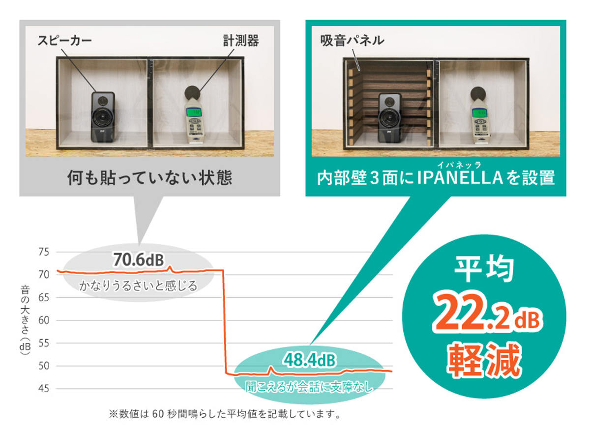 箱に入れたスピーカーから3500Hzの音を発生させ、隣接した箱に計測器を入れて騒音レベル(dB)を計測しました。