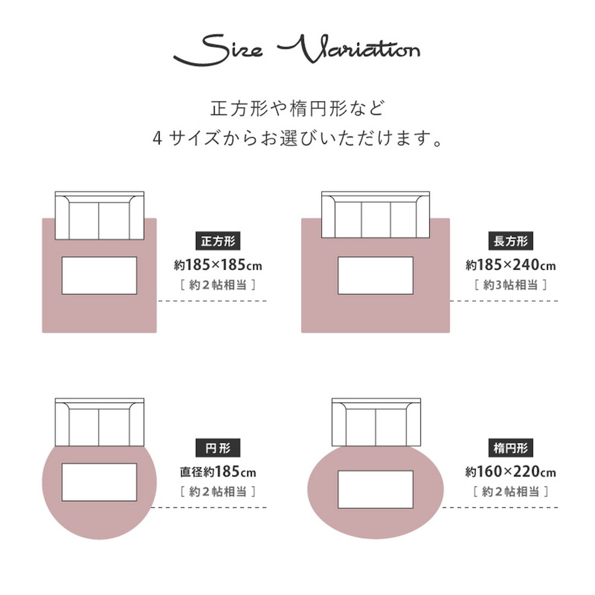 大きめのソファーを置いても余裕のあるサイズ感のラグです。ゆっくりとくつろぎたいリビングや寝室でのご使用におすすめです。