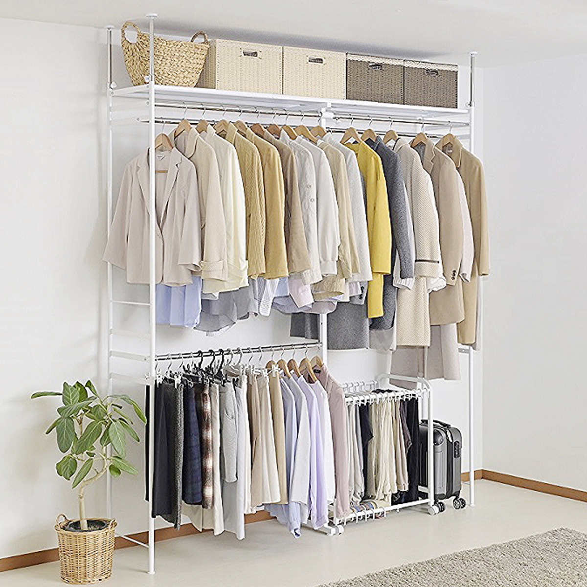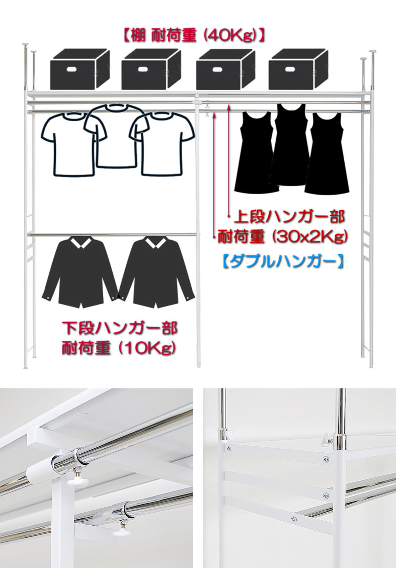 | 耐荷重 | 110kg (棚:40kg、上段ハンガー:30×2kg、下段ハンガー:10kg) |