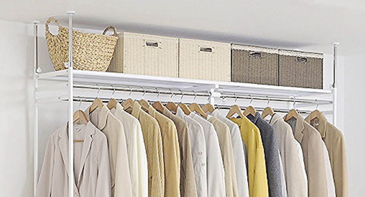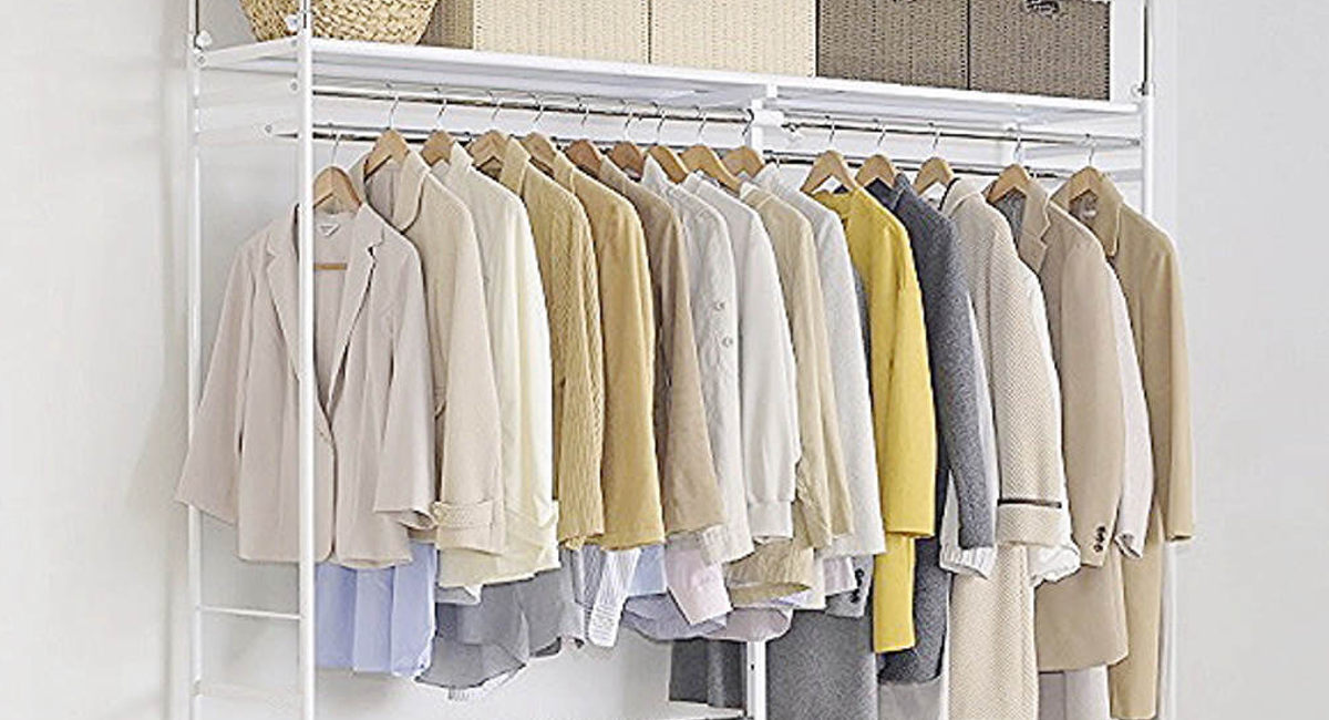 幅と高さ、どちらも伸縮できる突っ張りクローゼットです。お部屋の空いたスペースに収納を増やしたい時にぴったりです。上棚付きなので、衣類を掛けるのはもちろん、収納ケースやバッグなどの小物も一ヶ所に片付けることができます。