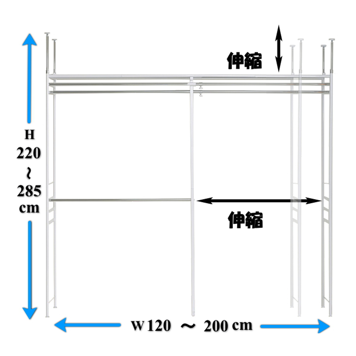 突っ張り ハンガーラック 幅120~200cm 高さ220~285cm ダブルハンガー ハイタイプ ワイド