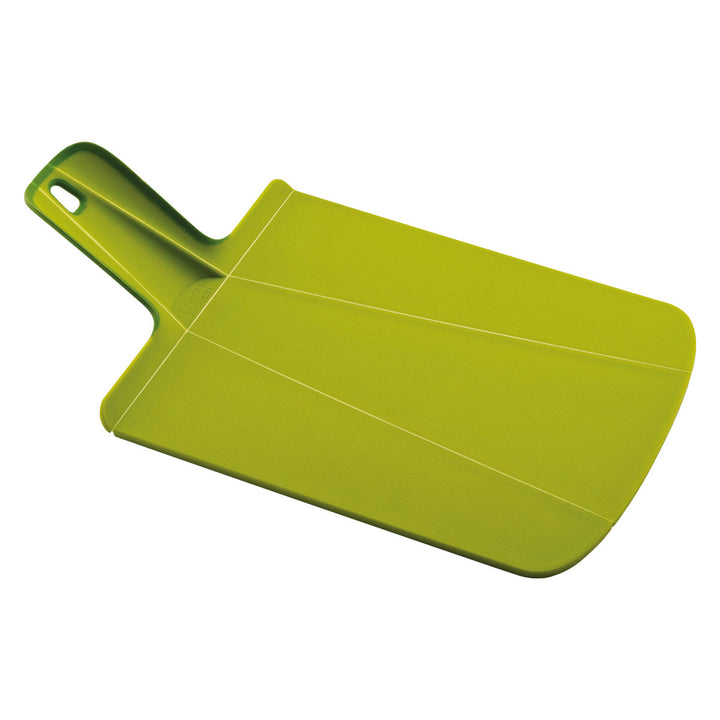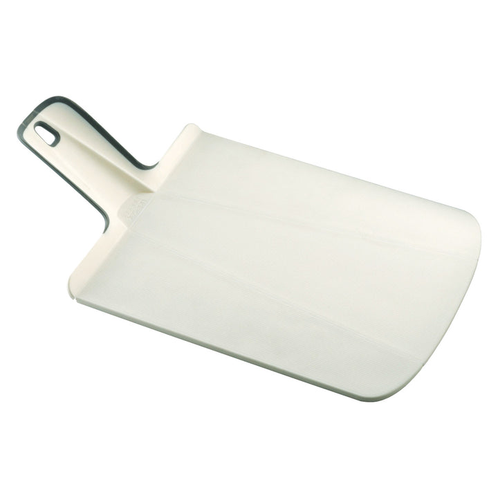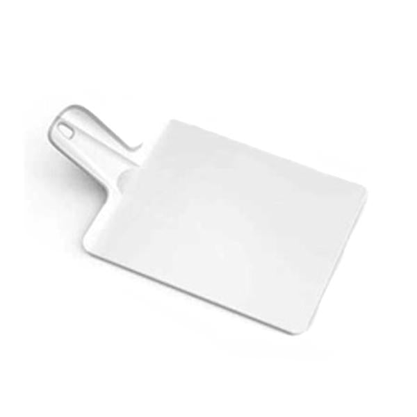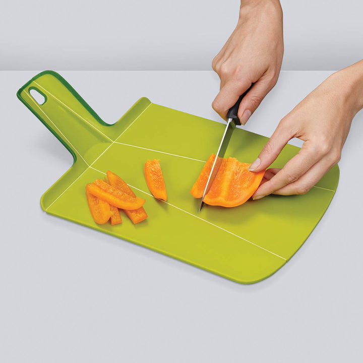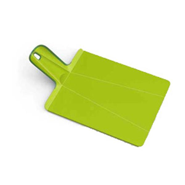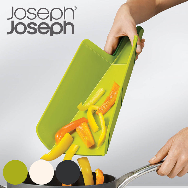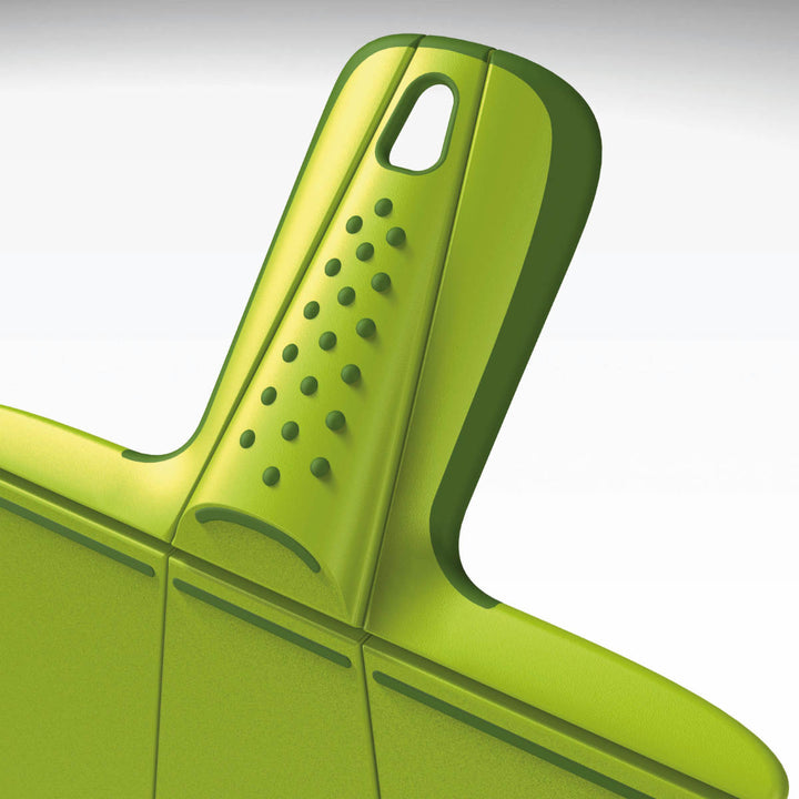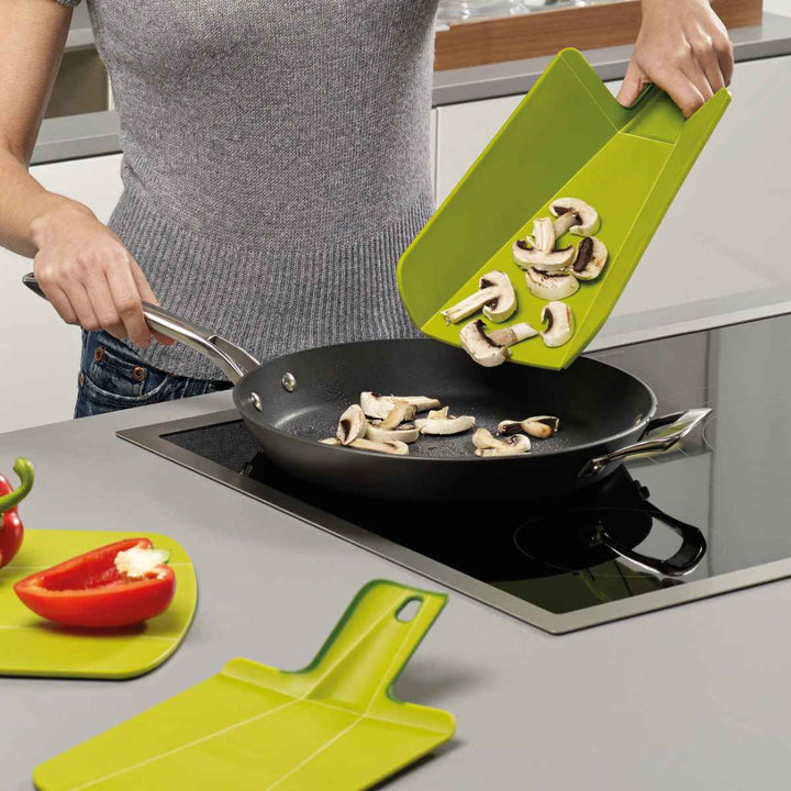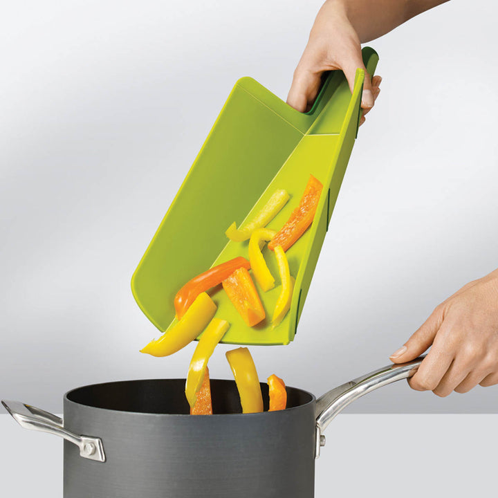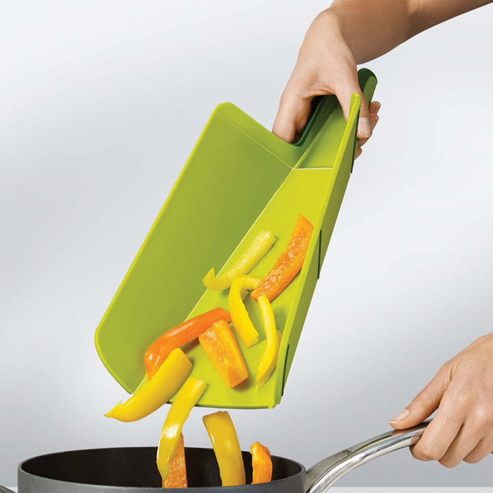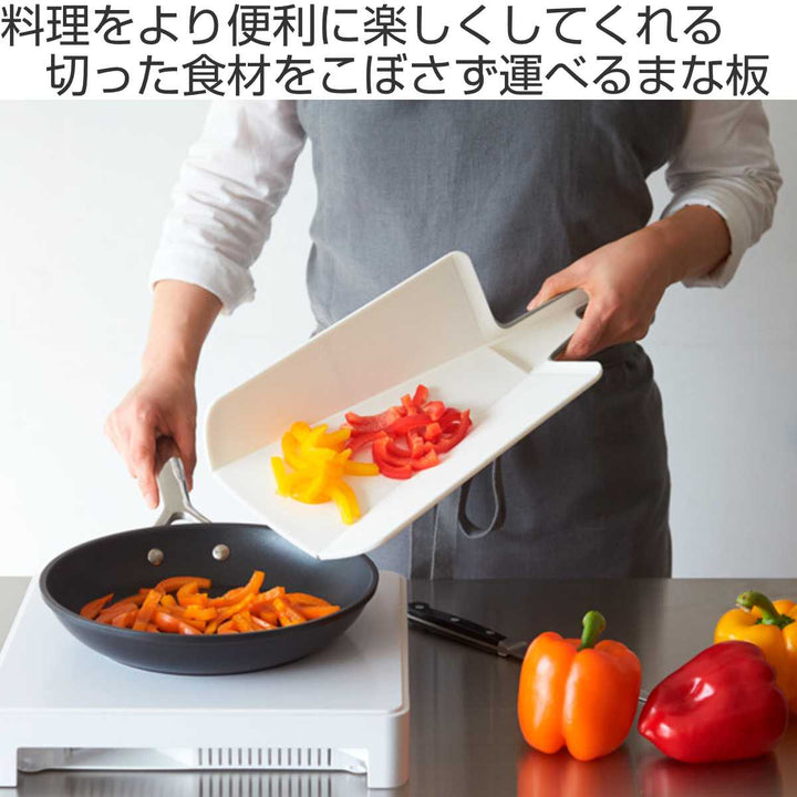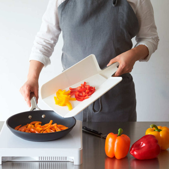 持ち手を掴んで簡単に折りたためる革新的なデザインのまな板です。折りたたんだ部分がガイドとなって、切った食材をスムーズにフライパンやお鍋に移すことができます。切りくずをごみ箱に移す時にも、こぼしたり落としたりしてキッチンを汚す心配もありません。