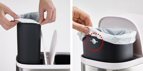 ゴミ袋をピシッとセット 内バケツにゴミ袋を掛け、背面中央の穴から余った分を引っ張って、ぴったりセットできます。 |