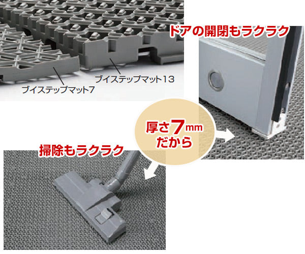 ブイステップマット13と比べ約半分の厚みです。薄型・軽量でハンドリング性に優れ、メンテナンス作業を短縮。マットと床が密着しない構造のため、マット表面に掃除機を当ててそのまま吸い込めます。また、スイングドアの引っ掛かりも防ぎます。