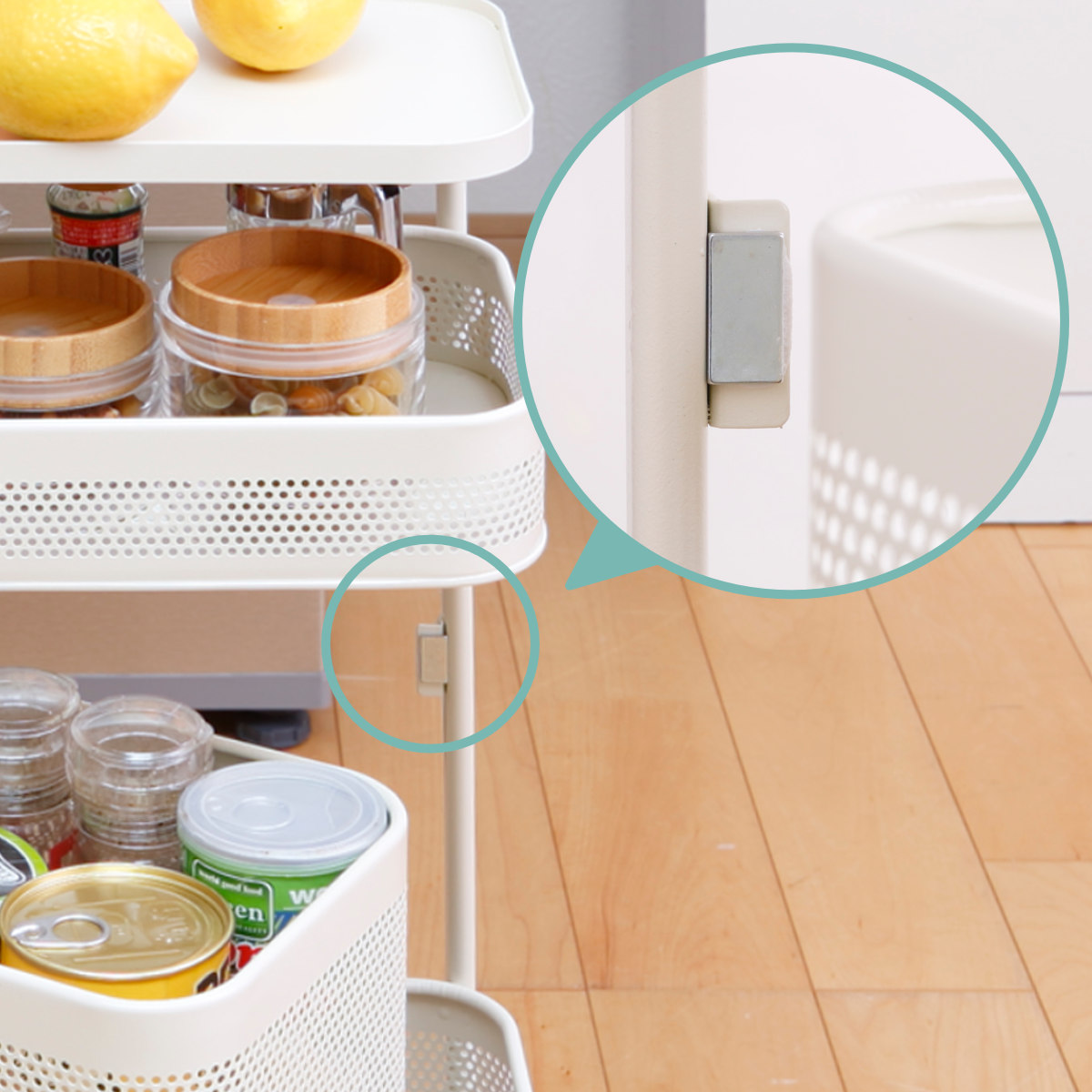 マグネットが使えるアイアン製ワゴンなので、フックなどを取り付けて収納を自由にアレンジできます。必要なものをすぐ手に取れる位置に置け、キッチン作業がスムーズになります。