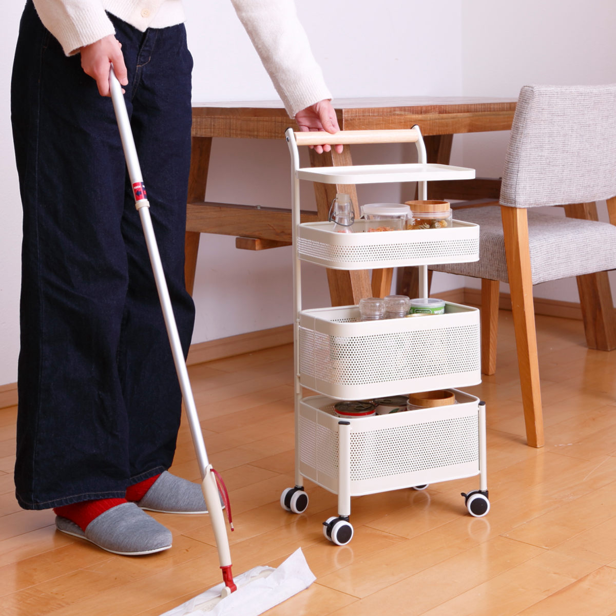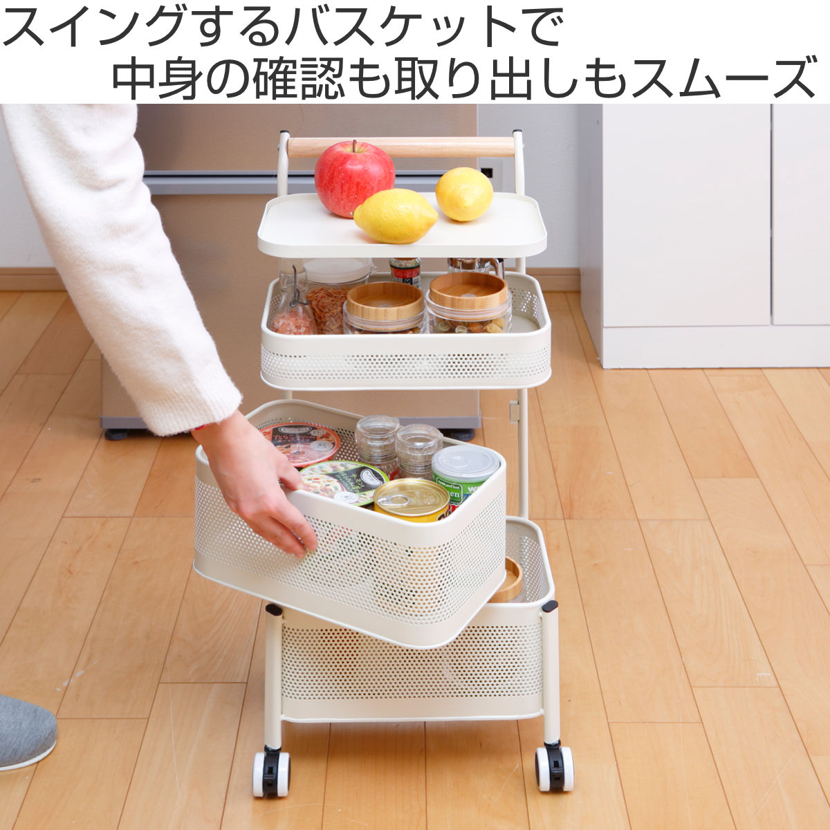 散らかりがちなキッチン小物をまとめてスッキリ収納できるキッチンワゴンです。深さの違う2段目と3段目のバスケットは取り出しやすいスイングタイプ。回転させれば中身の確認も簡単で、サッと取り出すことができます。