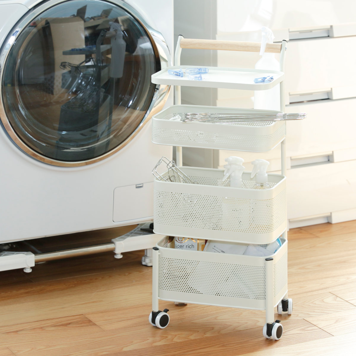 洗濯機横に置けば洗剤のストック収納やタオルなどの収納にピッタリ。すぐ手に取れる場所にスッキリとまとめて収納しておけます。