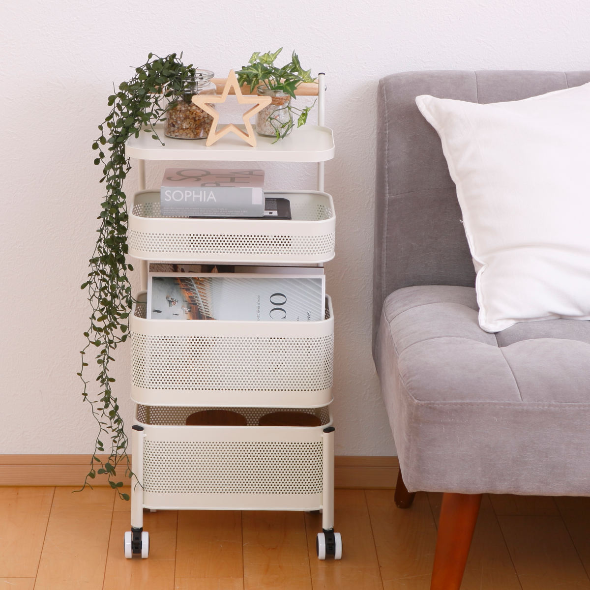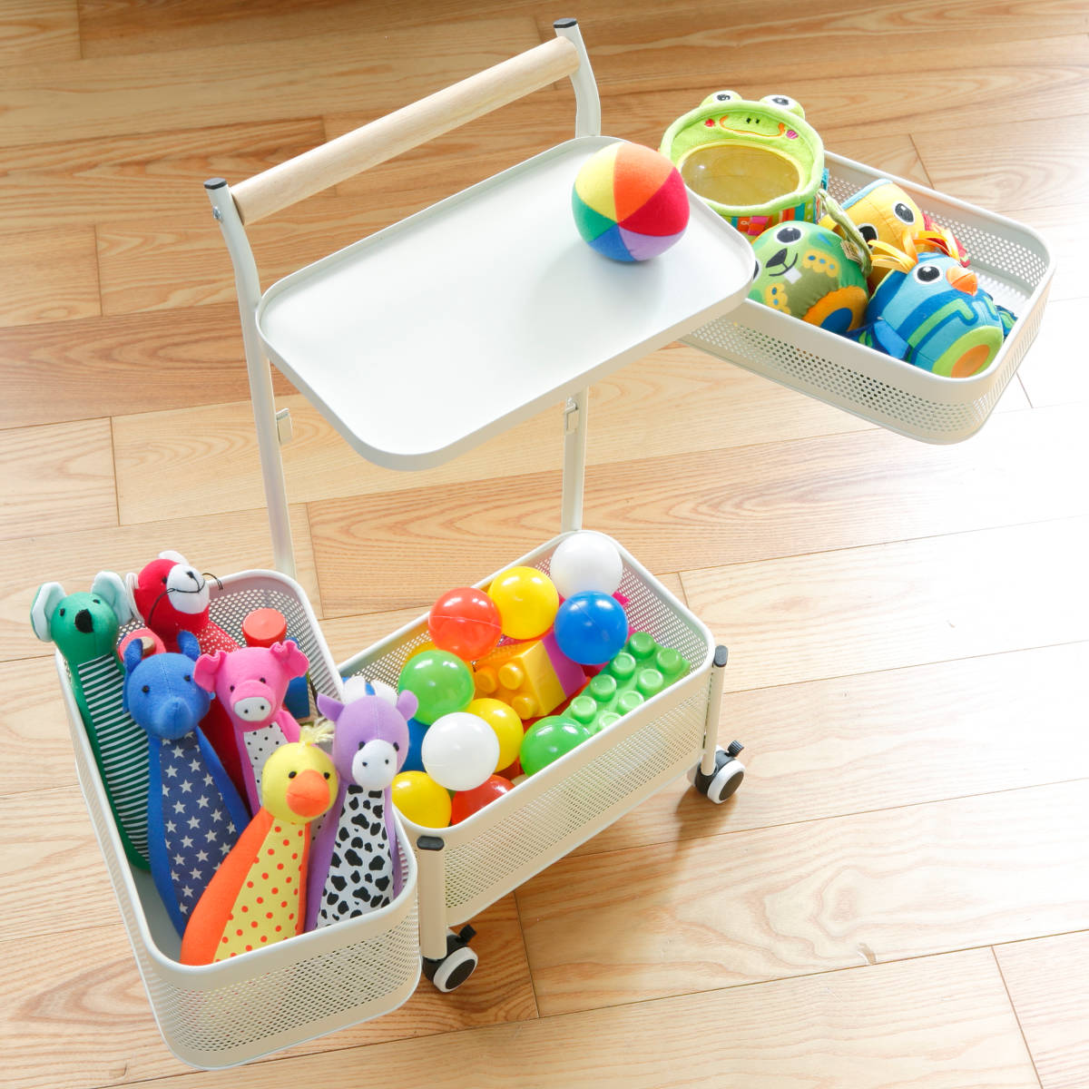 赤ちゃんのお世話に必要なベビー用品も仕分けしながらまとめて収納することができます。少し大きくなったらおもちゃや絵本など、子ども部屋のお片付けワゴンとしてもおすすめ。お子さまと一緒にお片付けを楽しめます。