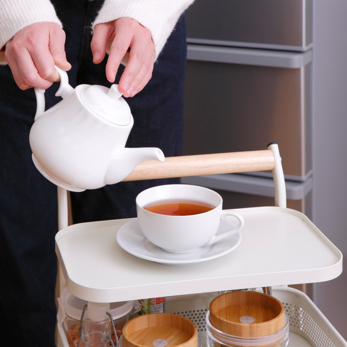 リビングなどでもインテリアの邪魔をしないシンプルなデザイン。リビングでは観葉植物や間接照明などをまとめて。カトラリーやティーセットなどを収納しておけばダイニングテーブルにそのまま運べます。