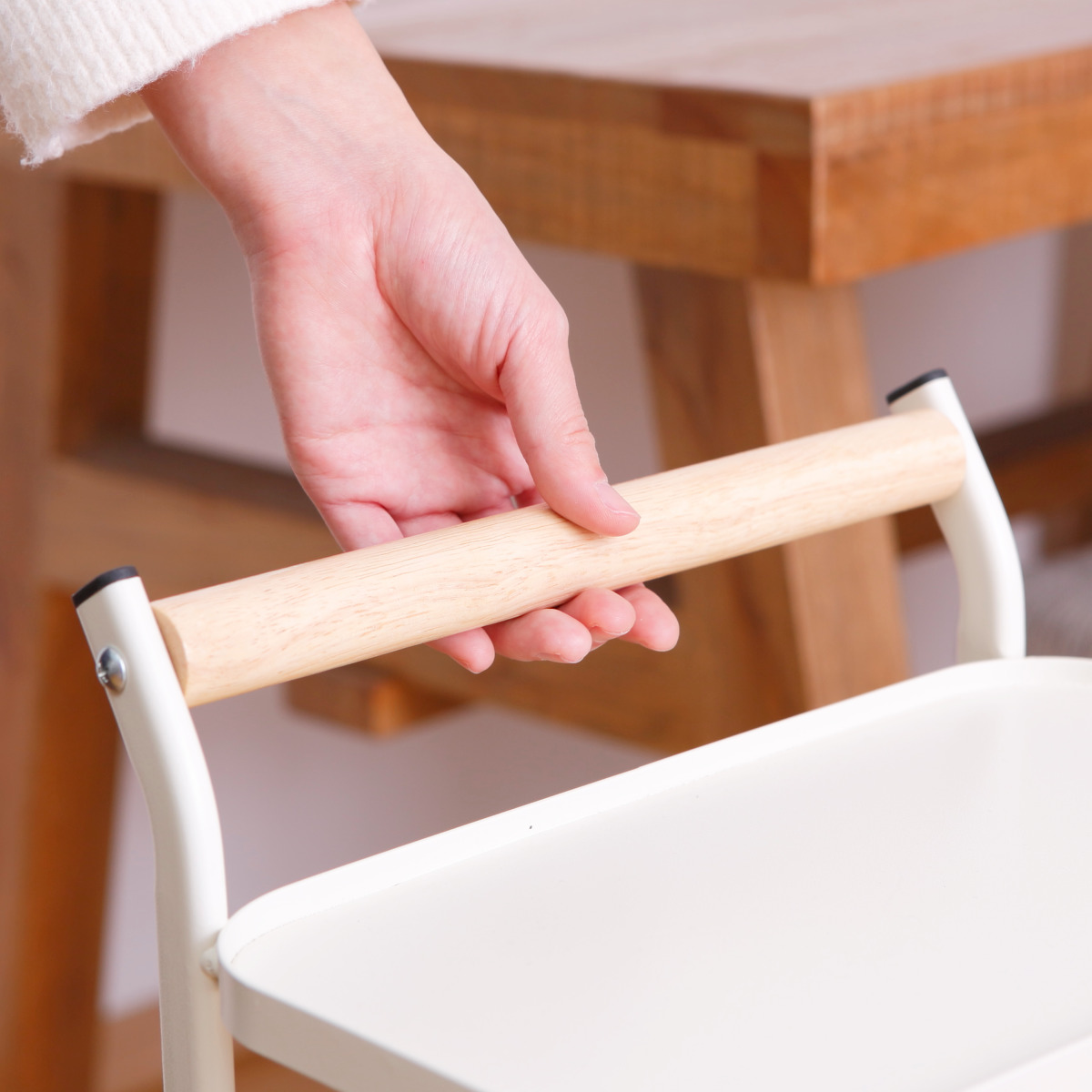 北欧風で可愛い木製ハンドル付き。収納場所からワゴンを引き出す時やワゴンを移動させる時も安心です。