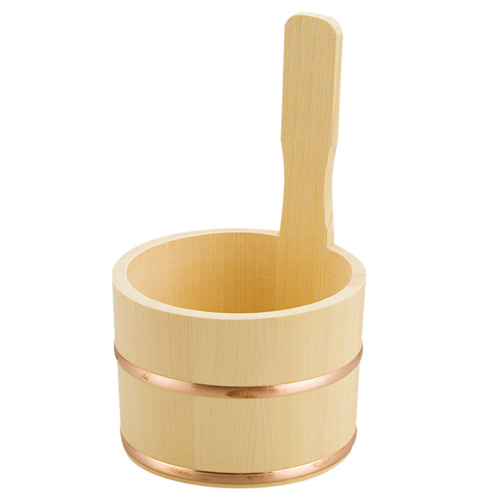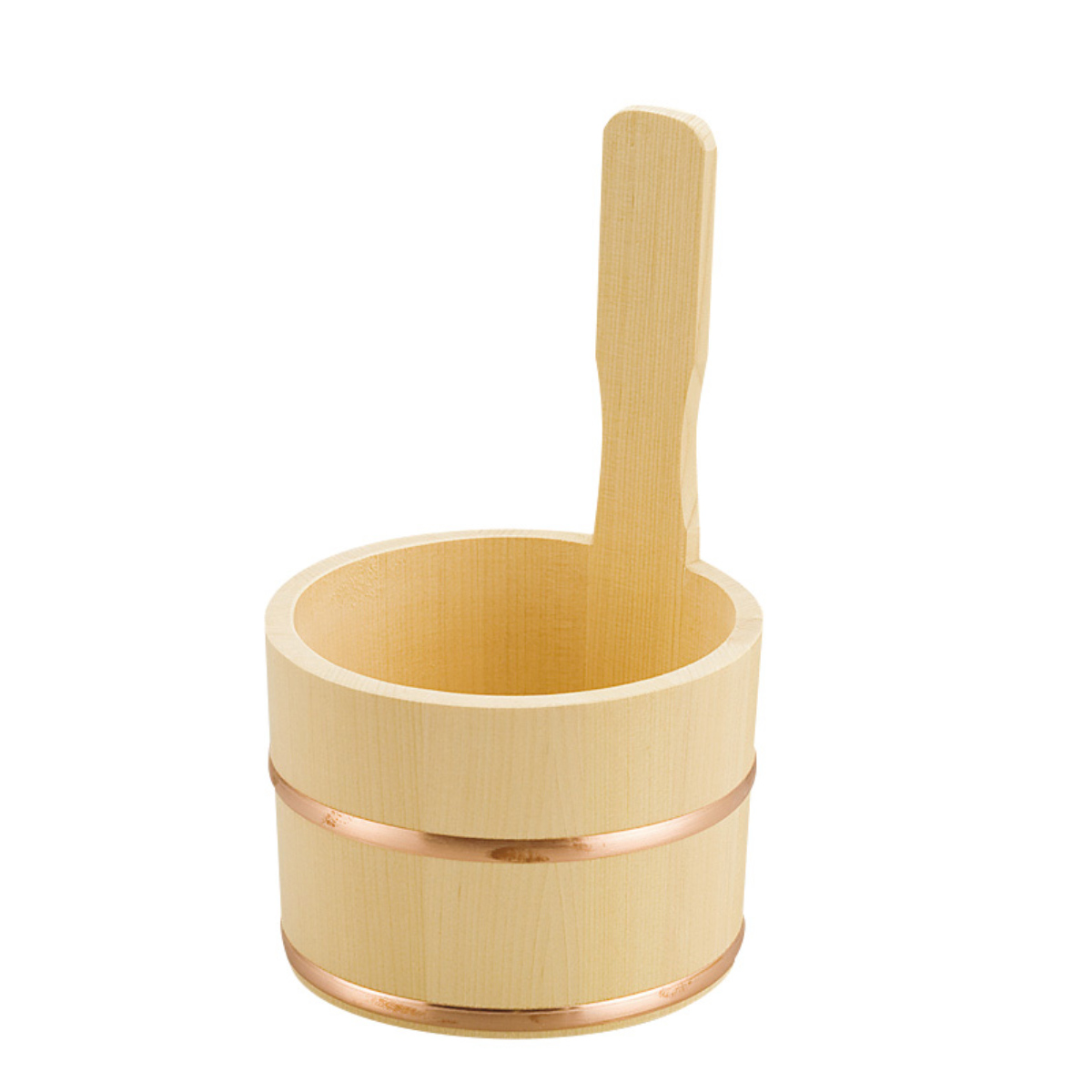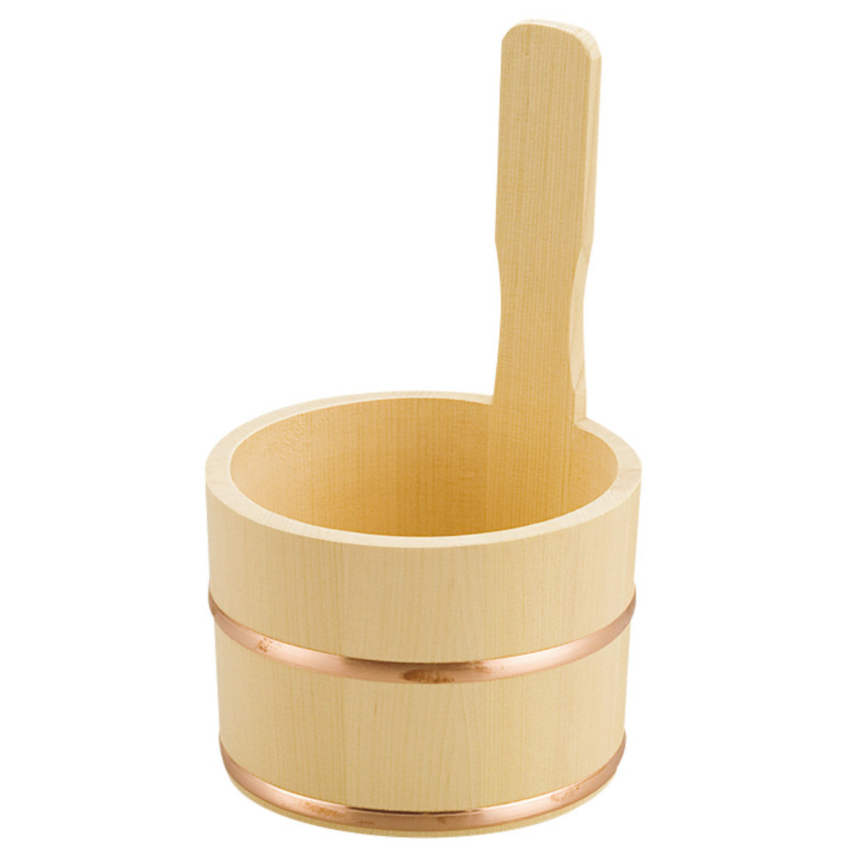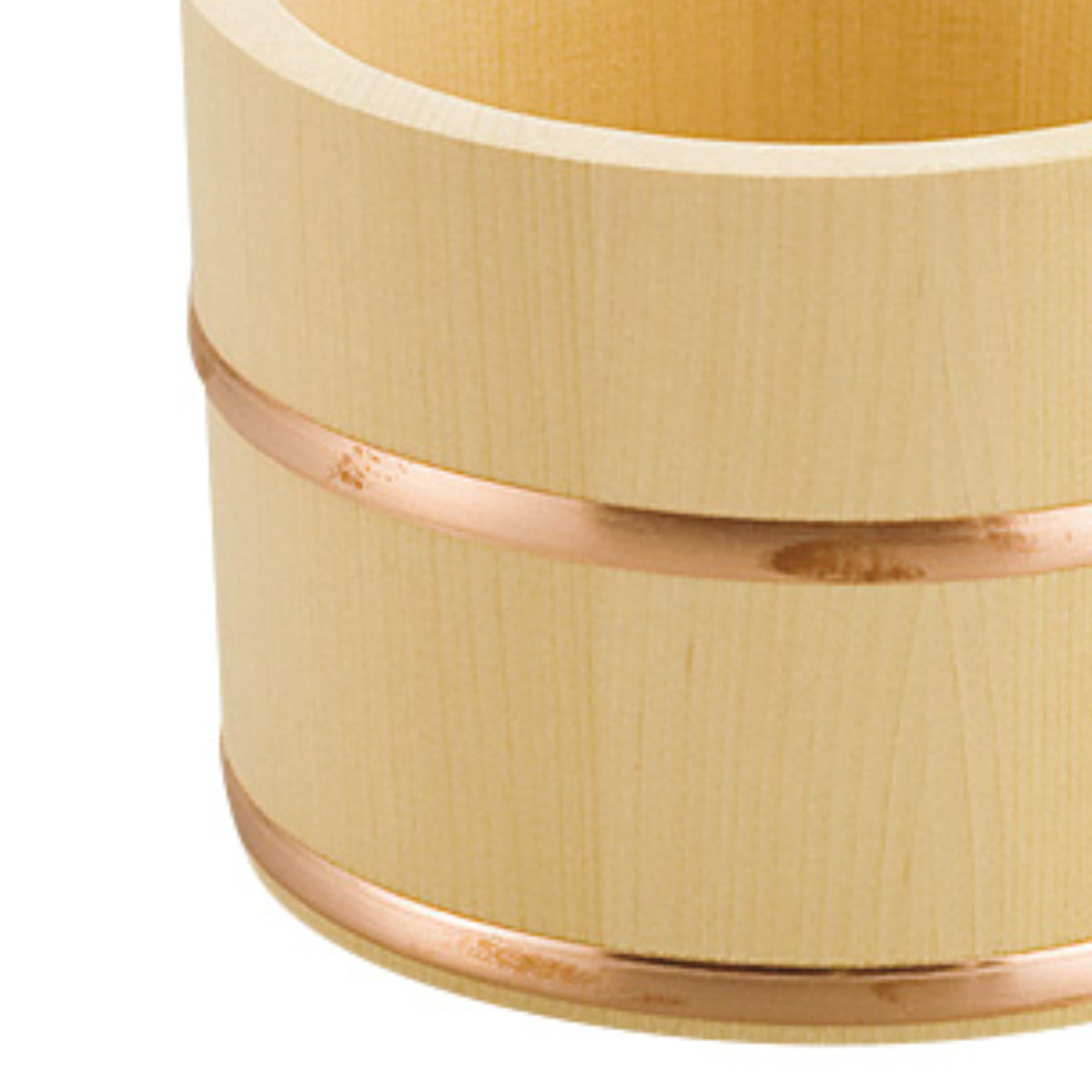 天然木の風合いが魅力的な、ヒバ製の片手湯桶です。タガに「銅」を使用しており、装飾性が高く、工芸的な印象です。