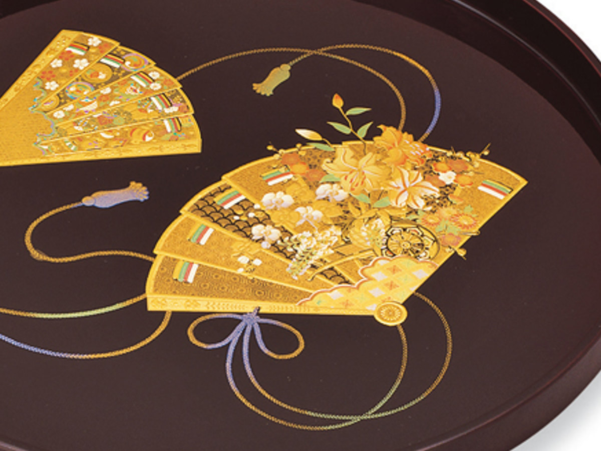 扇は、開いたとき先端のほうが広がることから「繁栄」を表す縁起の良いモチーフで、昔から「末広」とも呼ばれてきました。空を舞う天人の扇をイメージした蒔絵は、やわらかな動きと華やかさがあり、食卓を上品に彩ります。