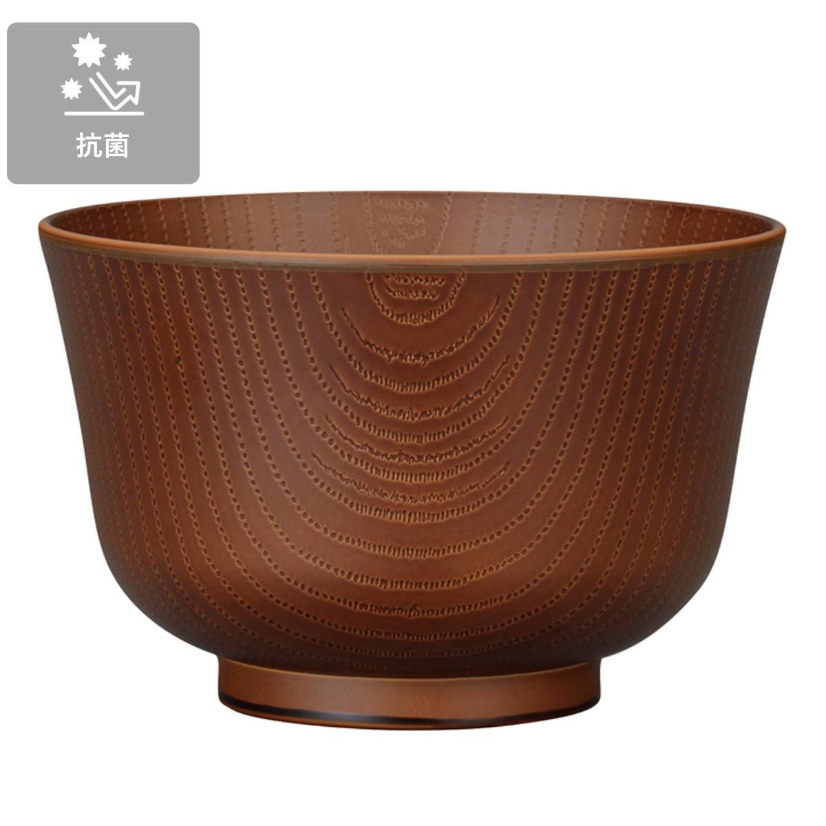 樹脂製で軽くて割れにくい小さめの丼です。縁がゆるやかに広がる百合型のシルエットが美しく、やさしい口当たりが特徴です。少なめの丼ものや小盛りの麺類、お茶漬けや雑炊など、軽めの食事や一人分の盛り付けにちょうど良いサイズです。表面には抗菌加工を施しているため、細菌の増殖を抑え、毎日の食事を衛生的にサポートします。
