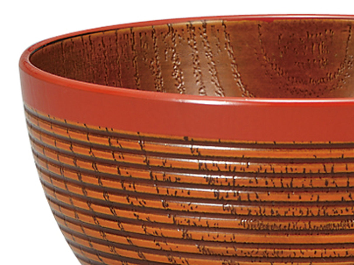 樹脂製で軽くて割れにくい汁椀です。欅を思わせる木目に千筋模様を施した、手に馴染むデザインです。味噌汁やお吸い物など普段使いに最適です。
