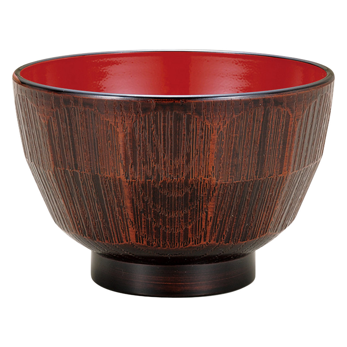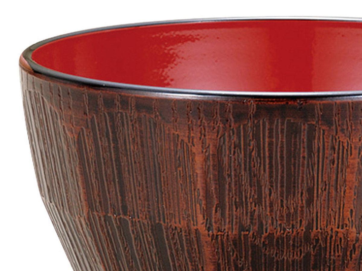 樹脂製で軽くて割れにくい汁椀です。木目にはつり調の凹凸を施した、手に馴染むデザインです。味噌汁やお吸い物など普段使いに最適です。