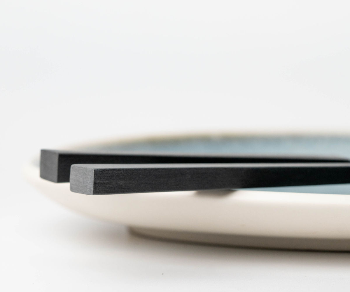 箸は、面に沿って指を添えることで持ちやすく、指先まで力を伝えることができる四角形です。細い箸にも刻印を施しています。さらっとしたマットな質感が心地よい樹脂製の持ち手は、まるで木で作られているかのような軽さで、やさしく手に馴染みます。