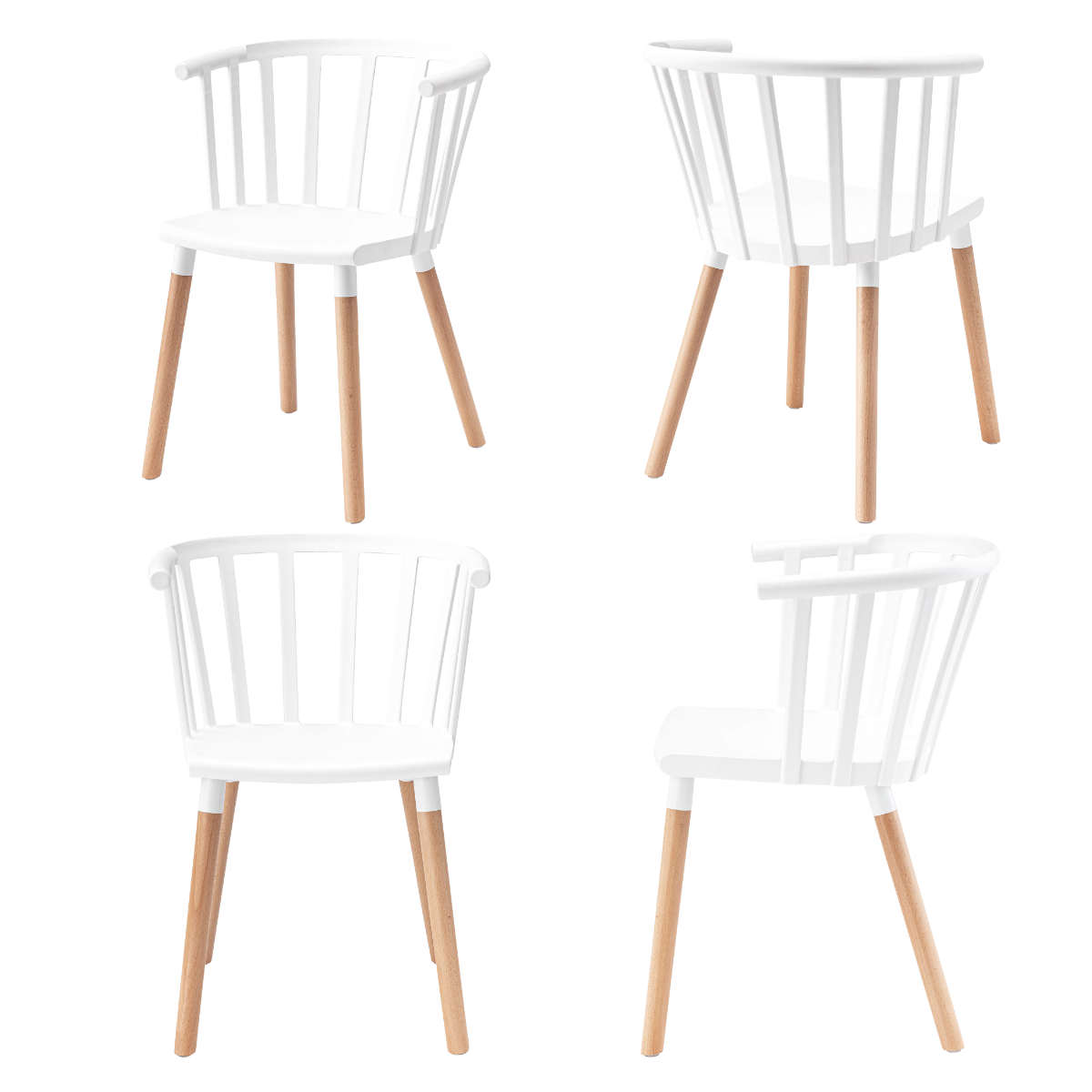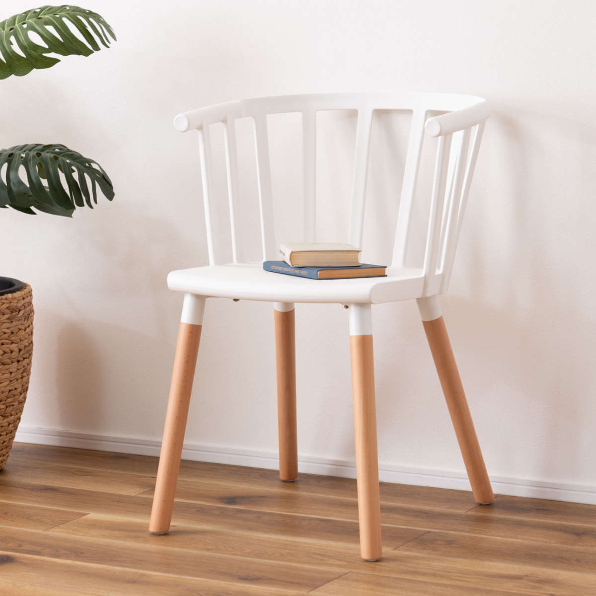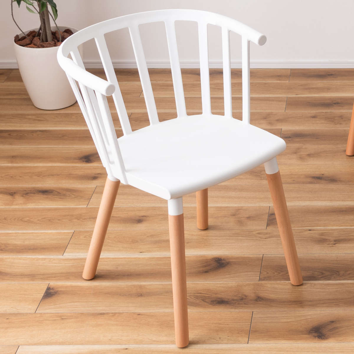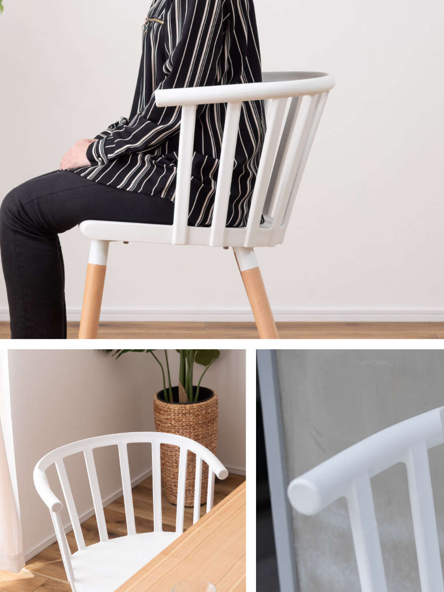 明るいホワイトの座面と、あたたかみのある天然木脚を組み合わせた北欧風デザイン。空間をぱっと明るく見せ、どんなインテリアにも自然と調和します。