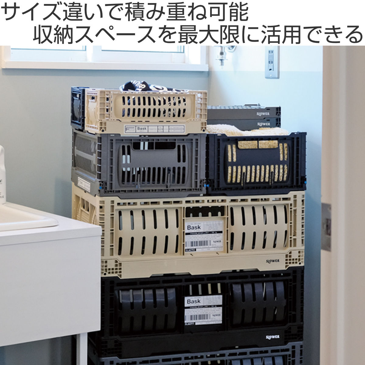 3サイズは積み重ね可能で、効率よく収納できるシンデレラフィット仕様。使わないときは平らに折りたため、省スペースで片付けられます。
