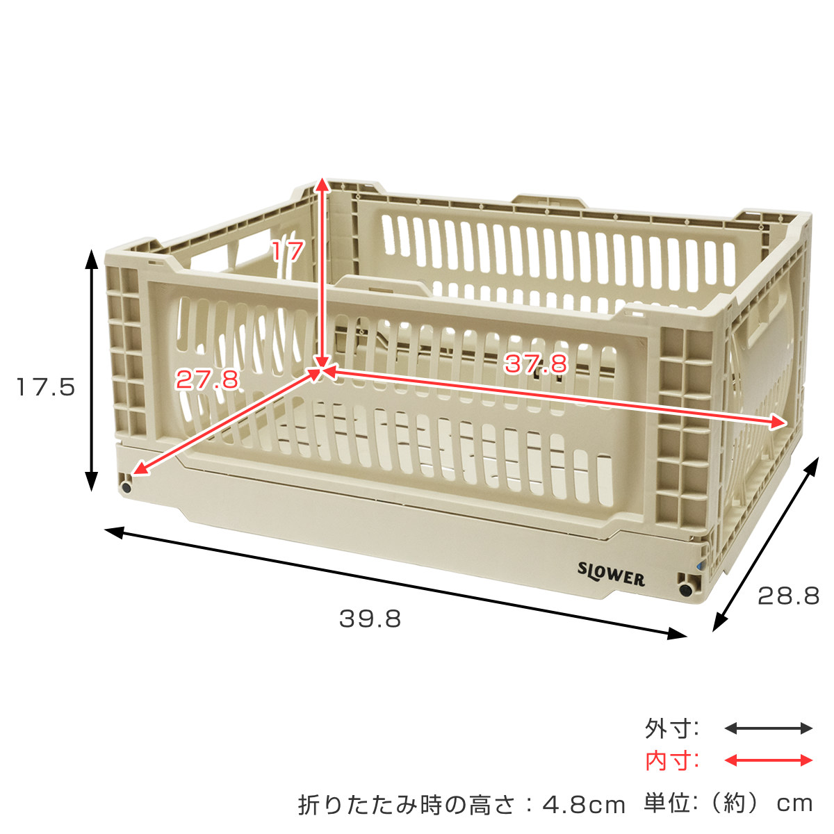 | サイズ | 外寸:約 幅39.8×奥行28.8×高さ17.5(cm) 内寸:約 幅37.8×奥行27.8×高さ17(cm) 折り畳み時の高さ:約 4.8cm |