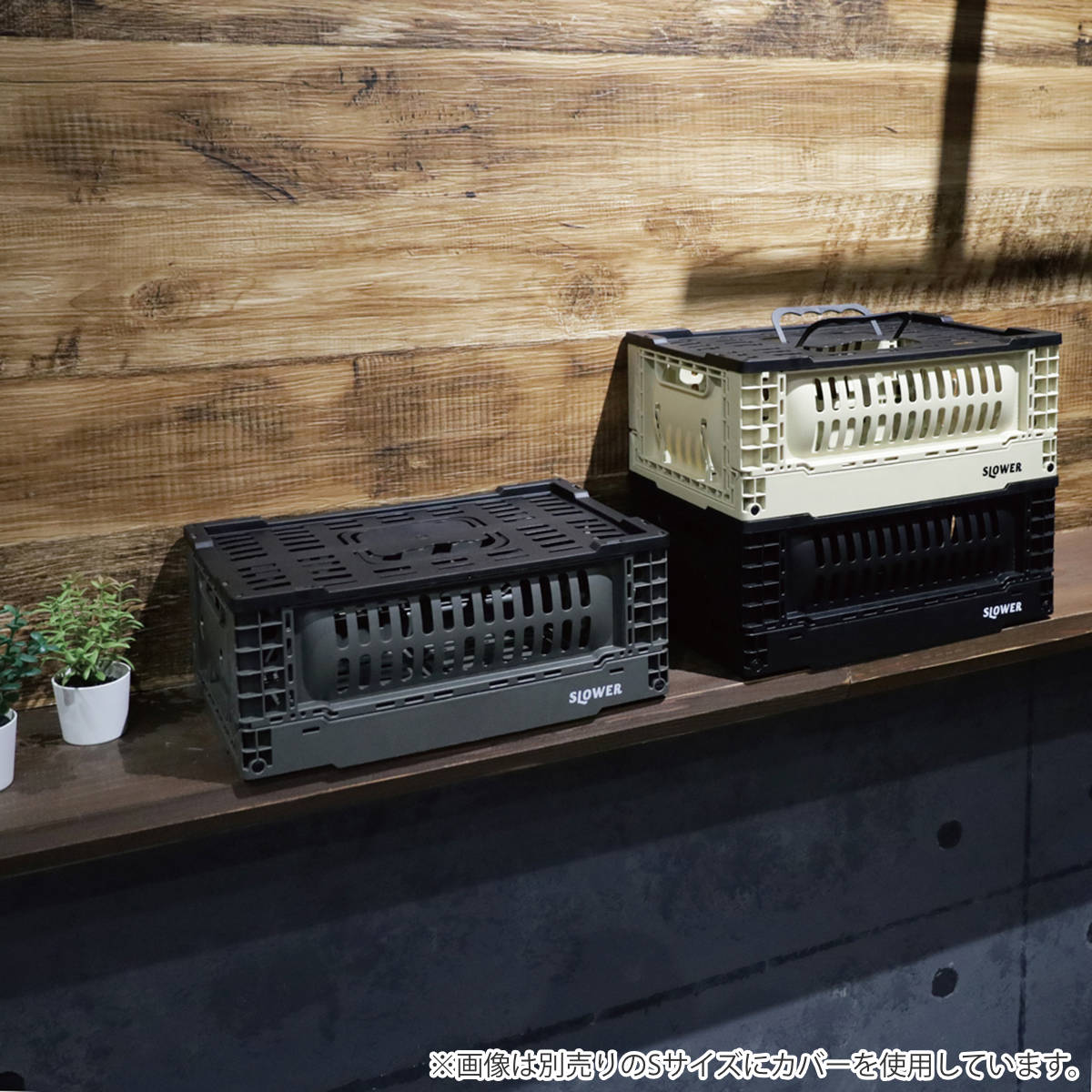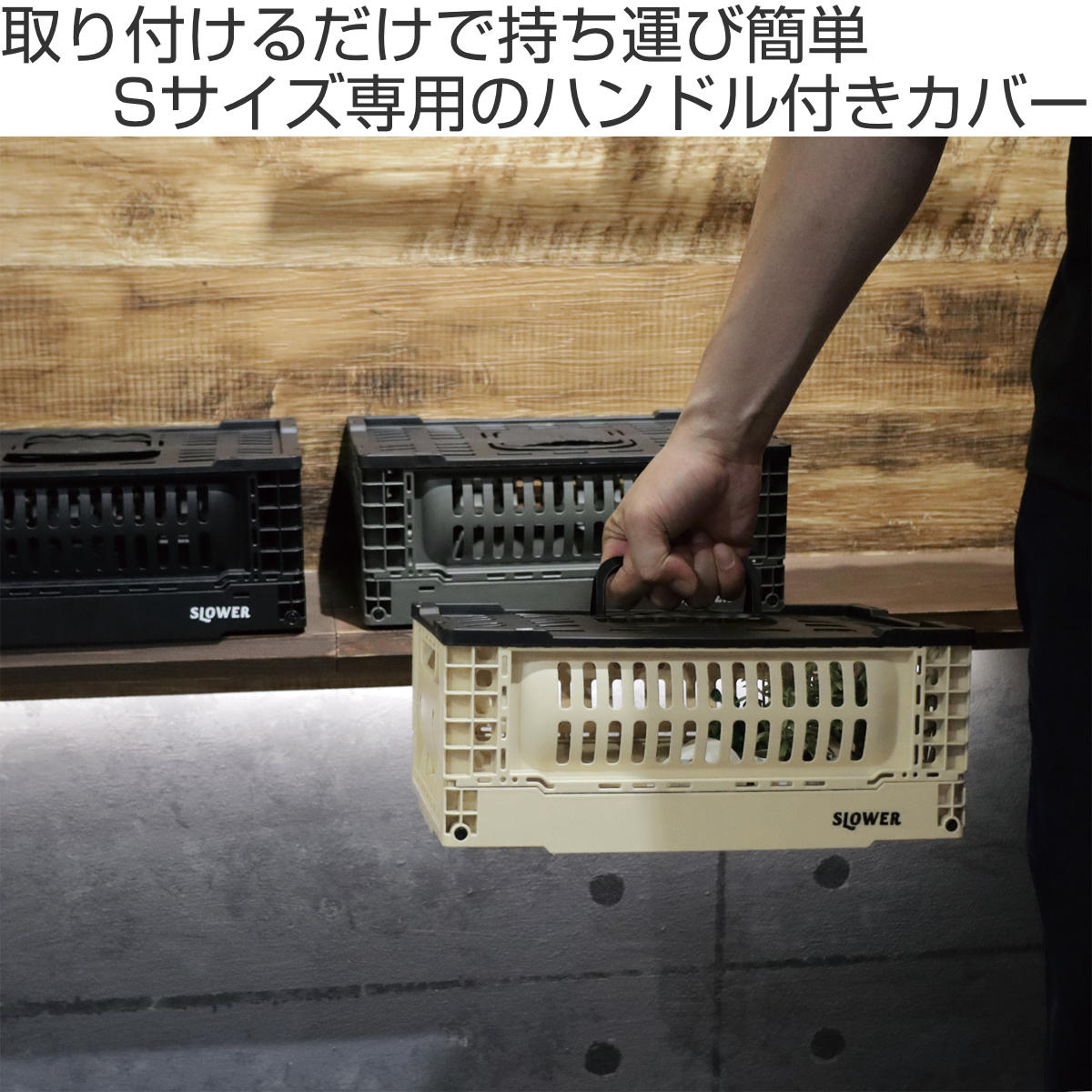 別売りの折りたたみコンテナ専用のハンドル付きカバーです。蓋としてはもちろん、持ち手付きなので持ち運びもラクラク行えます。ハンドルの重量制限は2kgで、ちょっとした移動にも気軽にお使いいただけます。