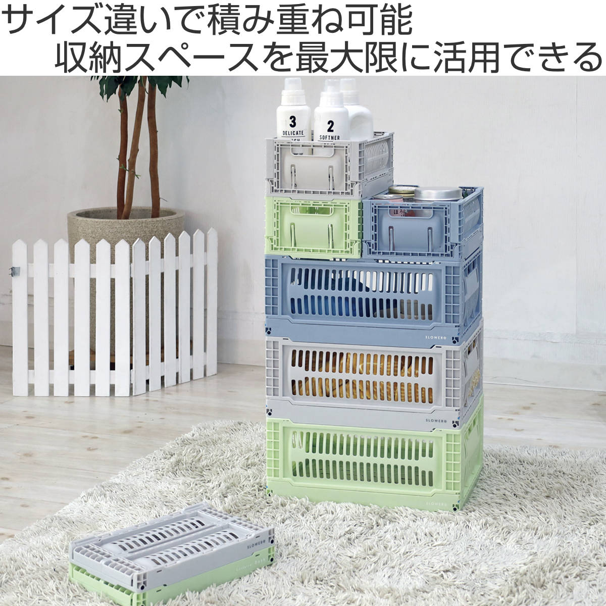 サイズ違いで積み重ね可能で、効率よく収納できるシンデレラフィット仕様。使わないときは平らに折りたため、省スペースで片付けられます。