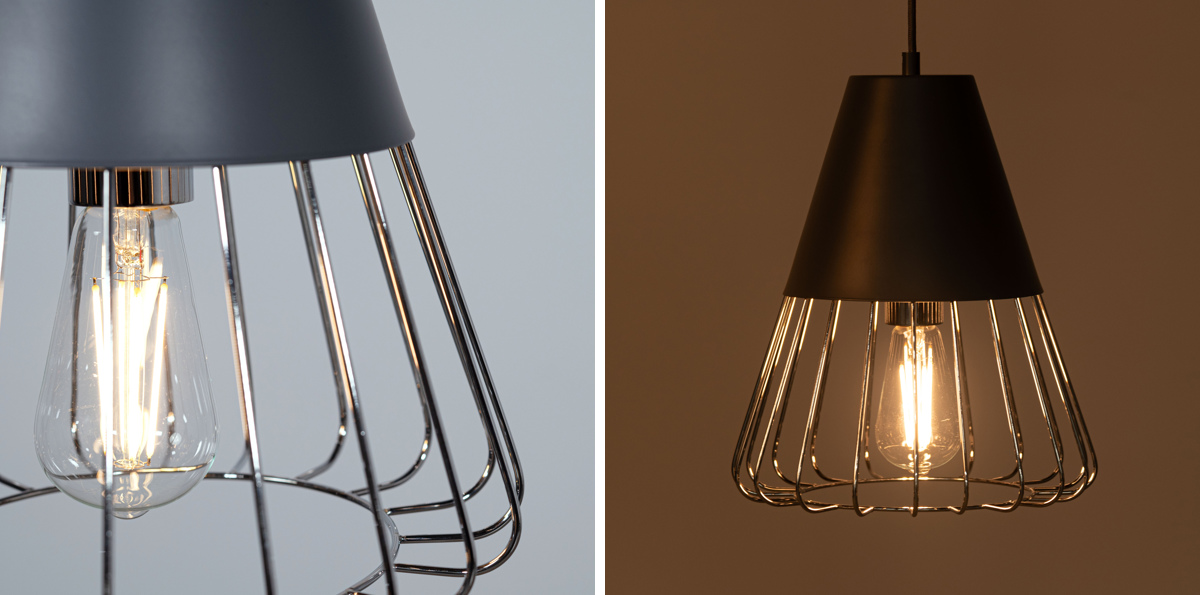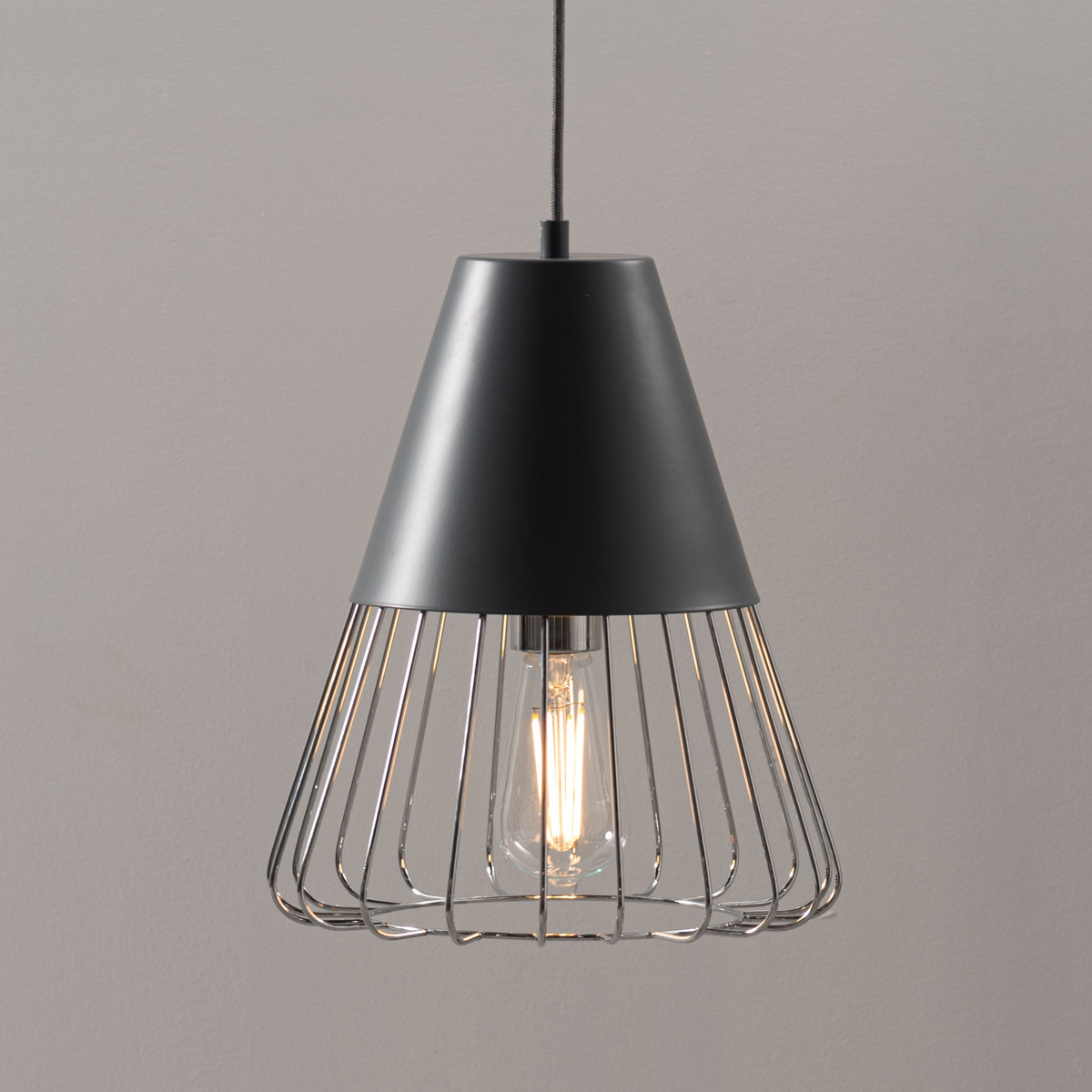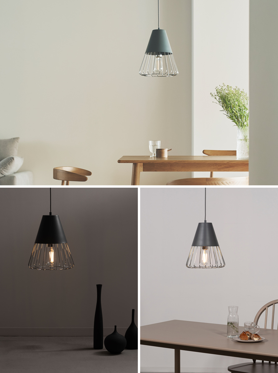 マットな質感のスチールとワイヤーフレームの組み合わせがスタイリッシュなペンダントライトです。シェード下部がワイヤーになっているので電球が露出し、どこか懐かしい雰囲気を演出します。点灯時に美しいのはもちろん、消灯時もインテリアとして存在感を放ちます。