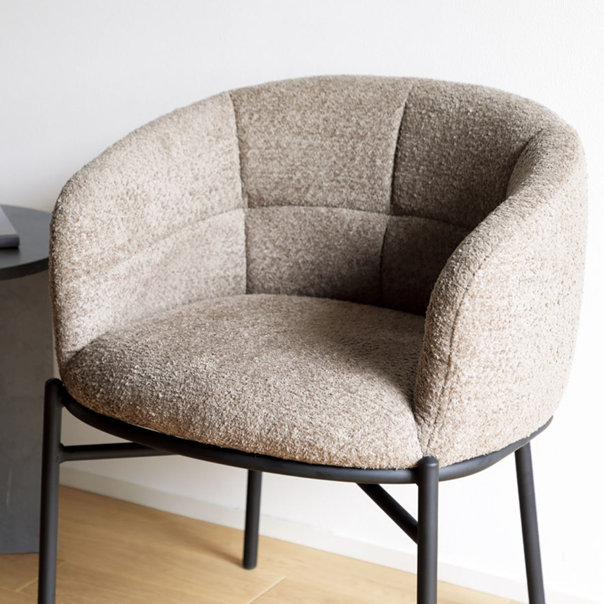 チェアの座面は、幅と奥行が広めのゆったりとしたサイズ感です。囲われた低めの背はひじ掛けとしても使え、自然と体をあずけてくつろげる座り心地です。
