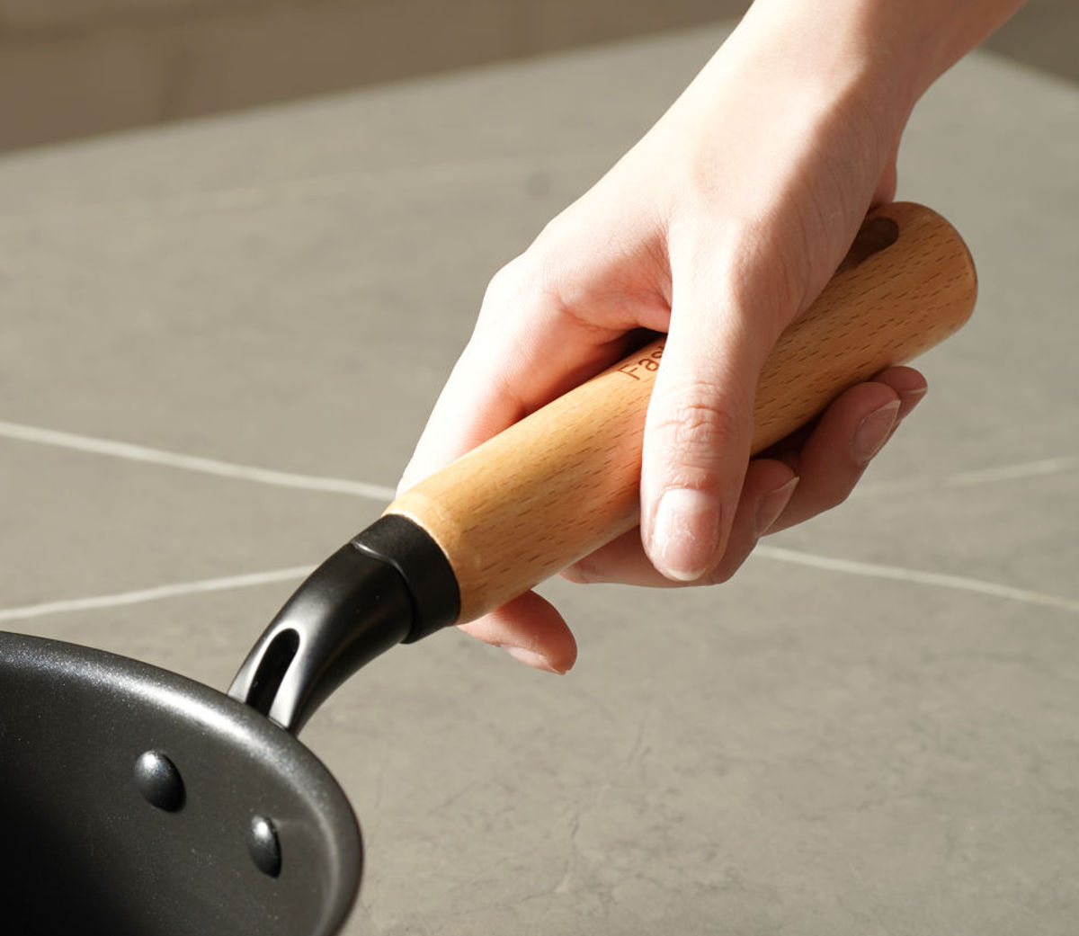 ハンドルには天然木を使用しています。上質なデザインかつ肌触りがよく手になじみます。