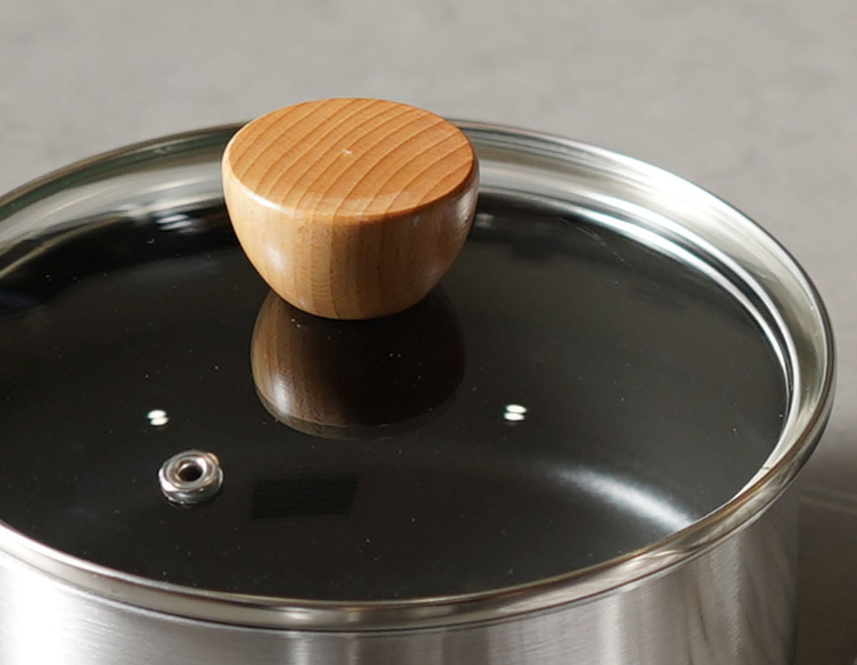 | 材質 | 【本体】ステンレス鋼(クロム16%)、アルミニウム合金 表面加工(内面):フッ素樹脂塗膜加工 取っ手:天然木 【蓋】強化ガラス(全面物理強化) 縁リング:ステンレス鋼 つまみ:天然木 |
