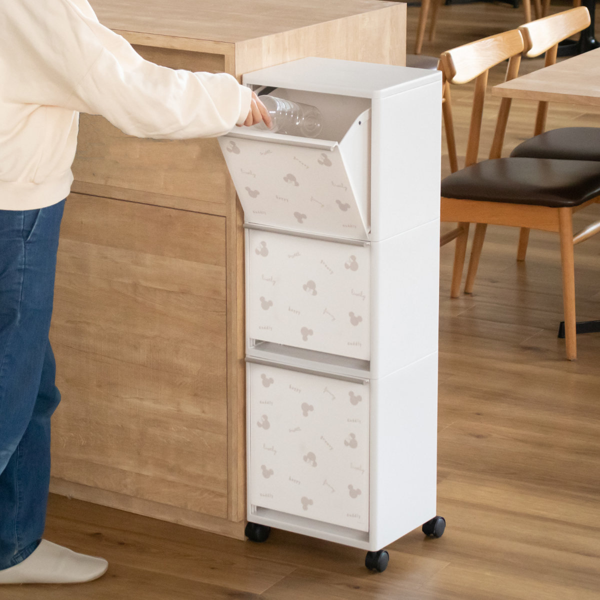 キッチンのデッドスペースに設置できる幅約33.5cmのスリムなダストボックスです。上段・中段はそれぞれ12.5L、下段は18Lで、かさばる資源ゴミもひとまとめに分別できます。