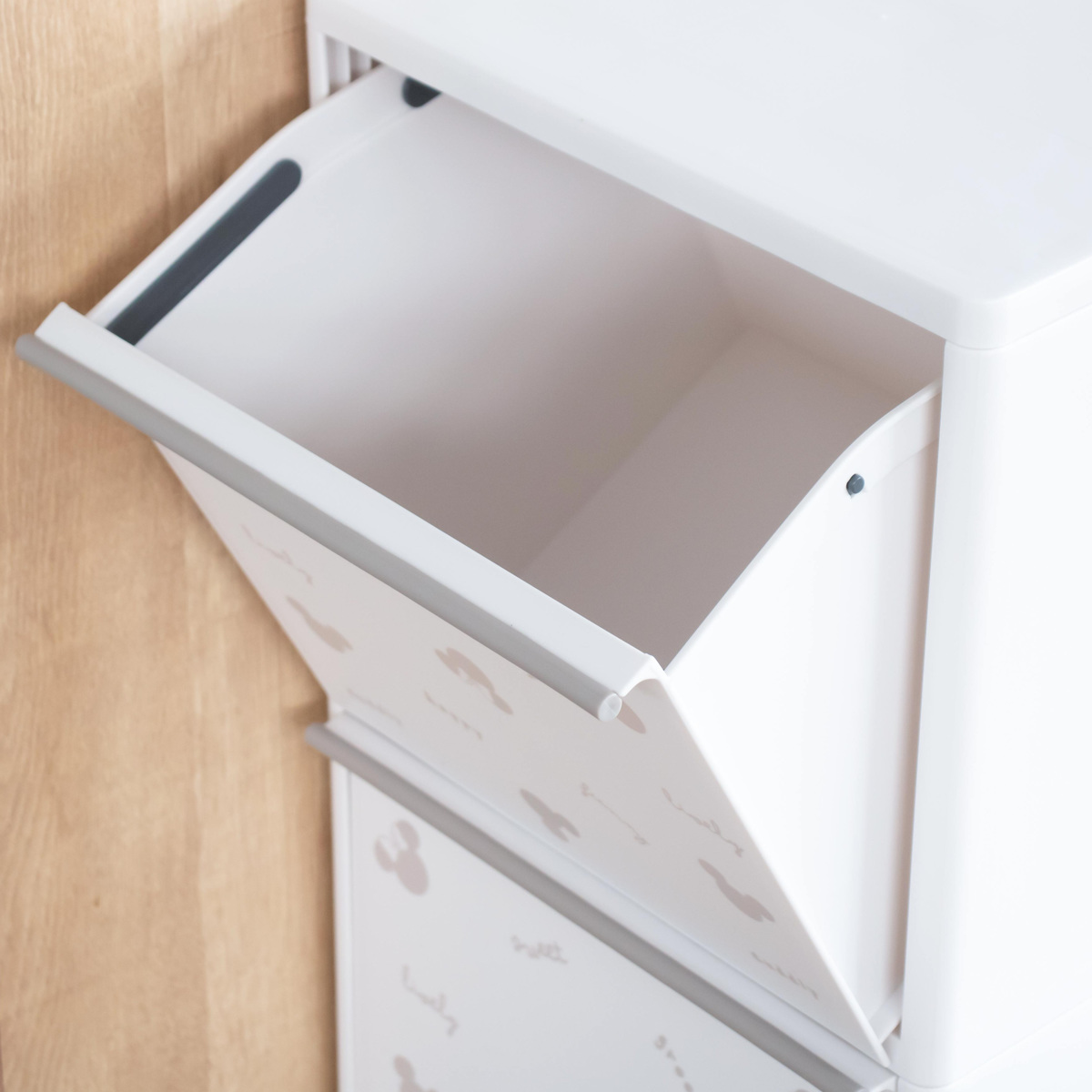 開け閉めしやすいフラップ式の引き出しです。手前に大きく開くため、ゴミを捨てやすく、開閉もスムーズ。ストレスなくご使用いただけます。