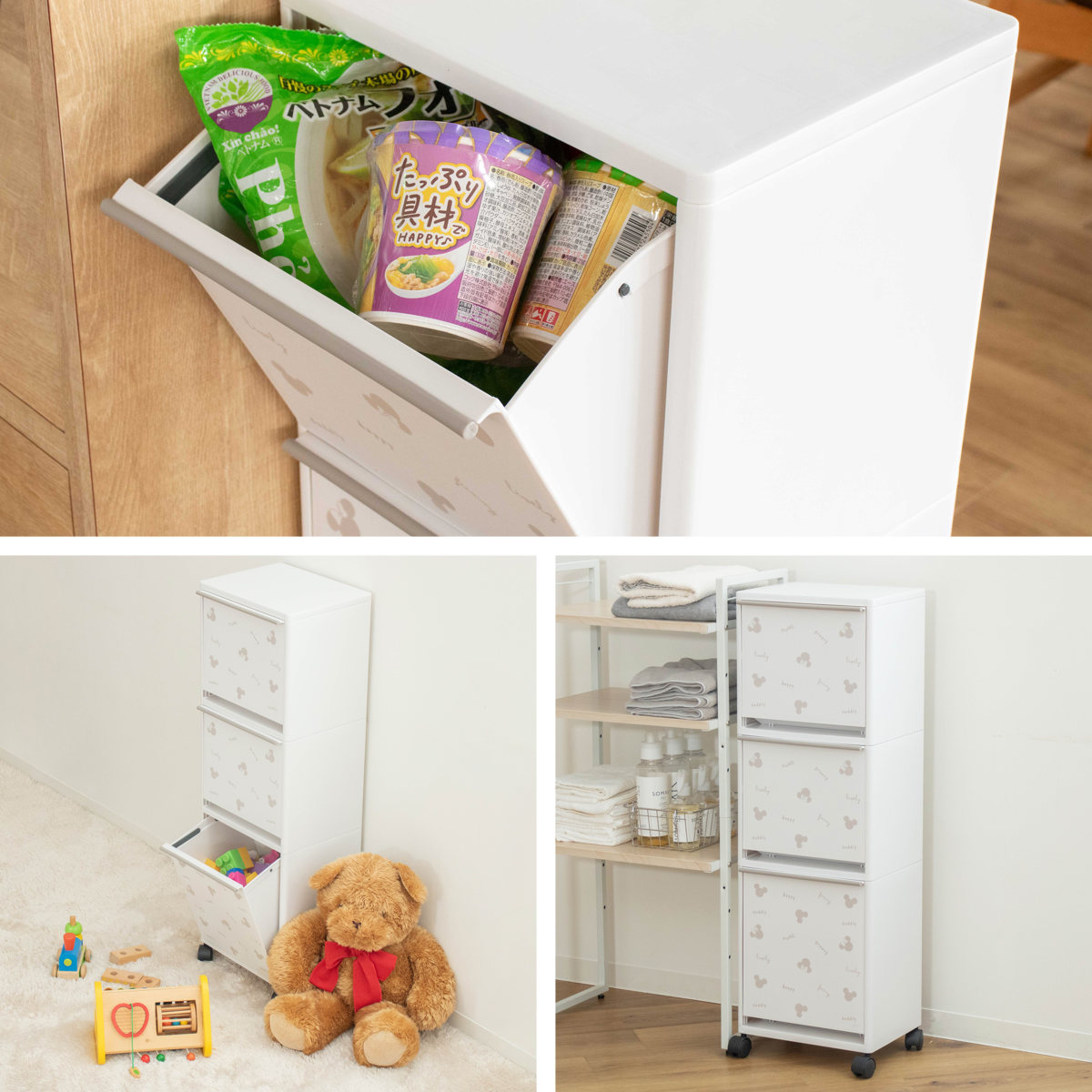 保存食のストッカー、子供部屋の収納ボックス、洗面所や玄関収納など用途に合わせて様々なシーンでご使用いただけます。