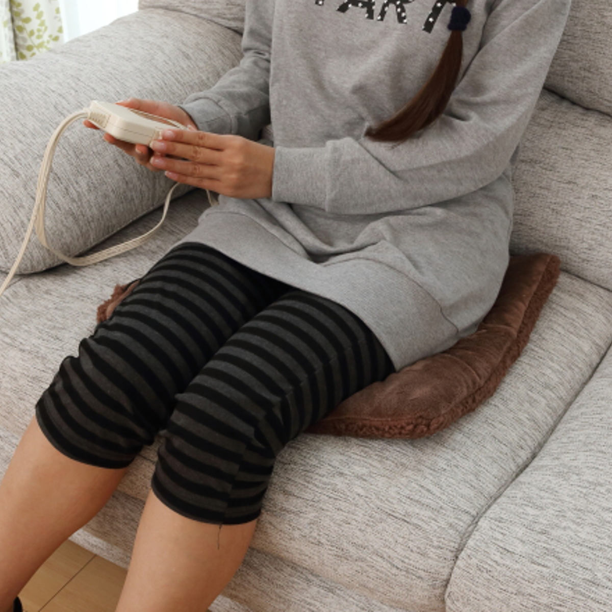 お尻を温めるホットクッションとしても使えます。なめらかでふわふわの生地なので、電気を入れなくても敷くだけで椅子のひんやり感を和らげます。