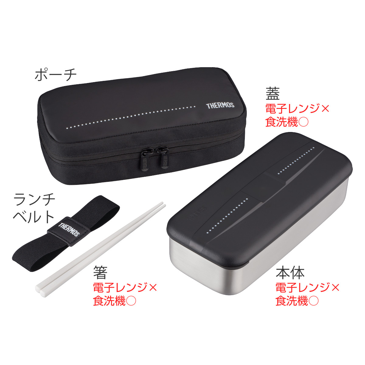 | 材質 | 【お弁当箱】 本体:ステンレス鋼 外蓋:ABS樹脂 内蓋、仕切り:ポリプロピレン パッキン:シリコーンゴム 箸:飽和ポリエステル樹脂 【ポーチ】 外生地:ポリエステル、ポリウレタン 内生地:ポリエステル クッション(断熱材):発泡ポリエチレン |