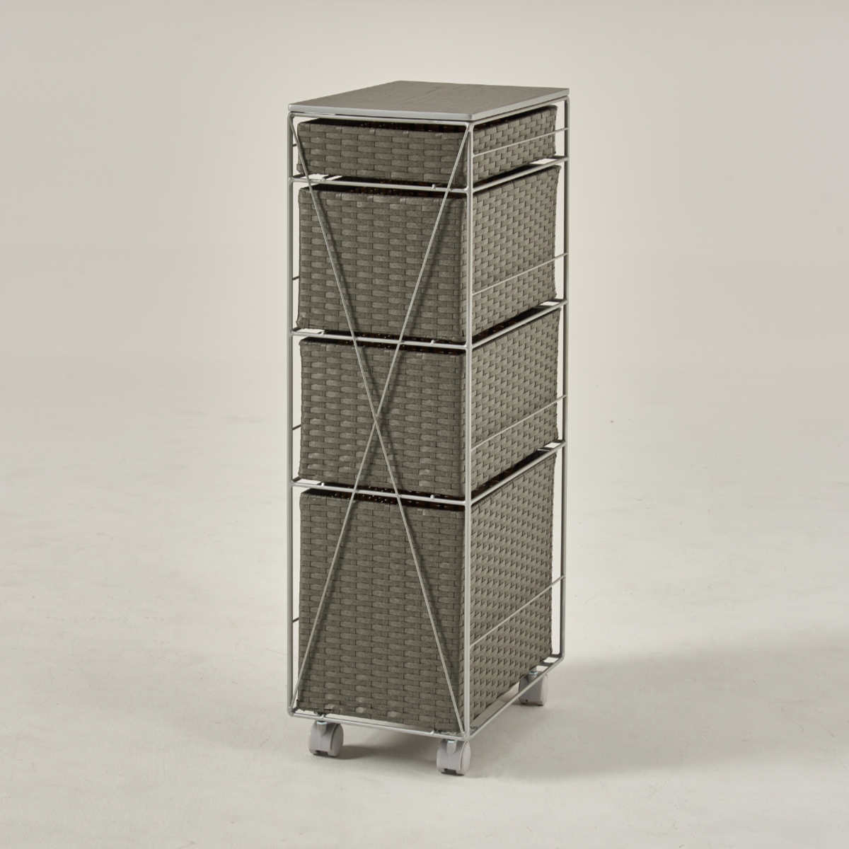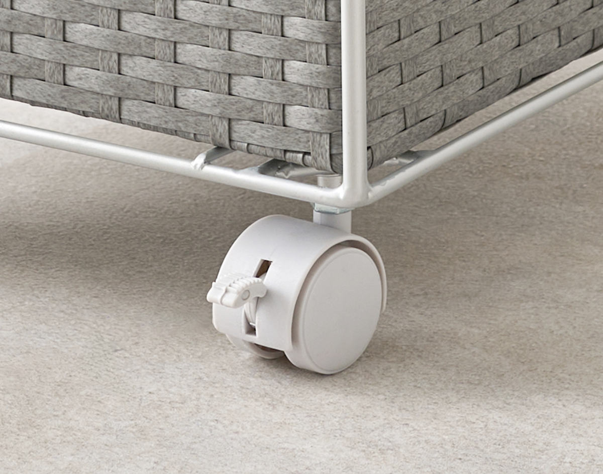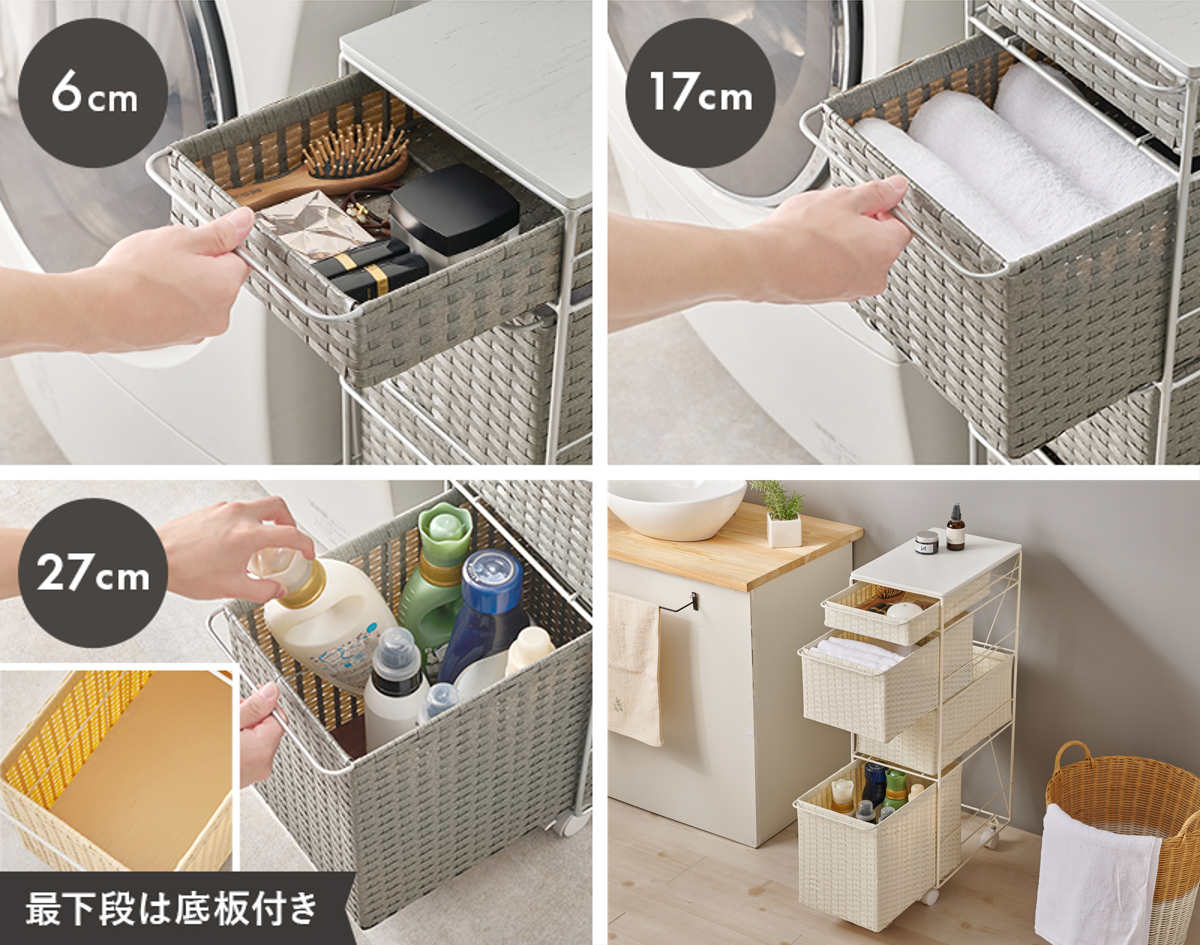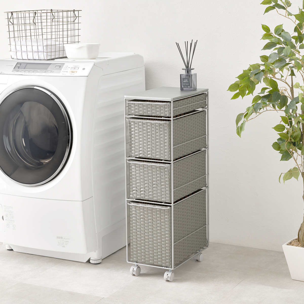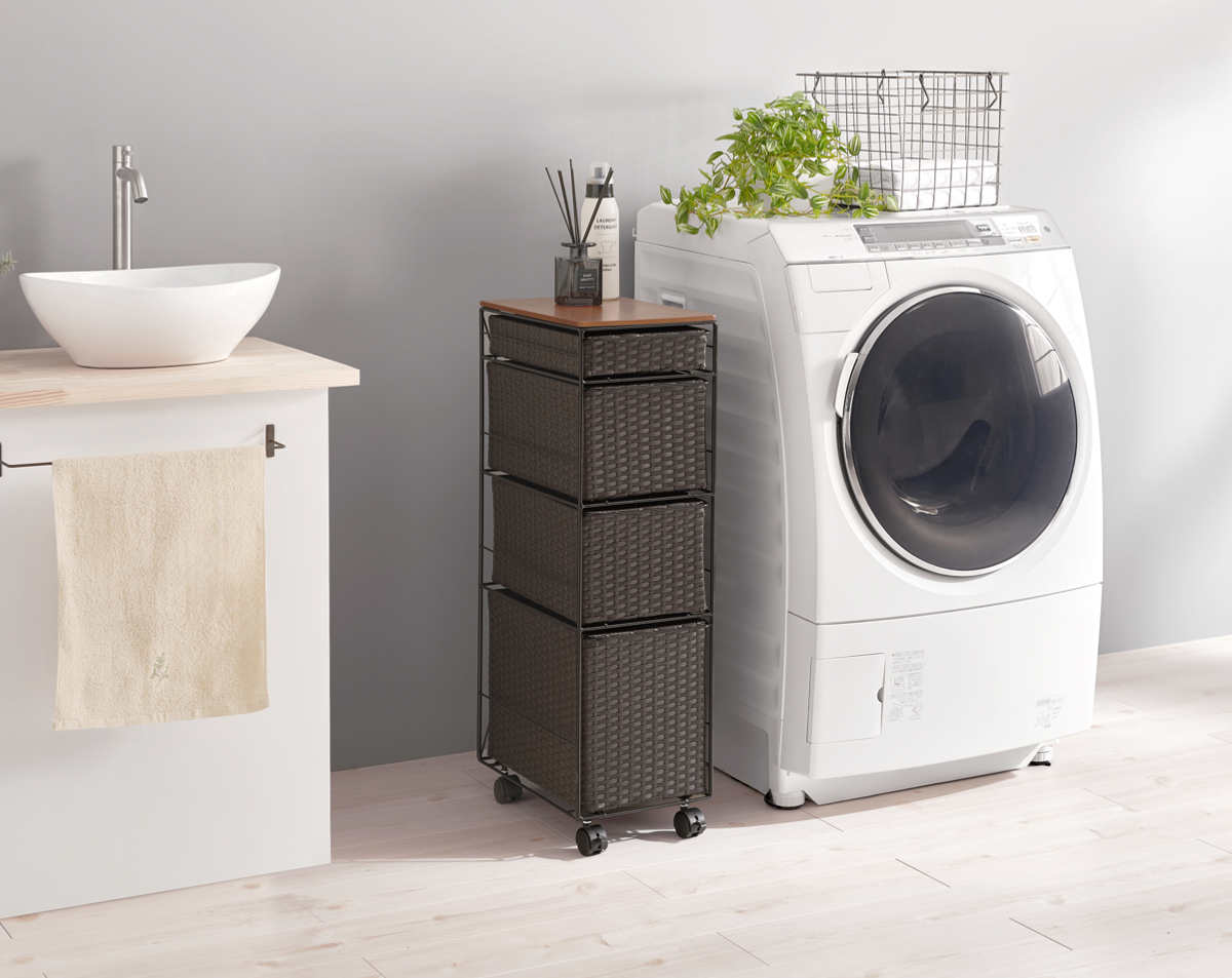 お手入れのしやすい樹脂製なので、水周りでも便利にお使いいただけます。通気性の良いラタン調のデザインで、衣類やタオルの収納にもおすすめです。