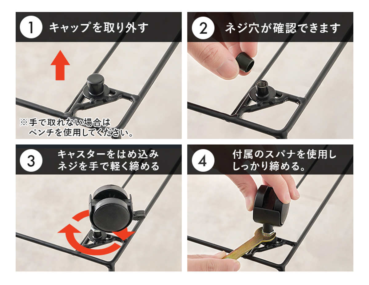 付属の工具でキャスターを取り付けるだけで、すぐにお使いいただけます。ほとんど完成した状態で届くので、組み立て家具や工具を扱うのが苦手な方にもおすすめです。