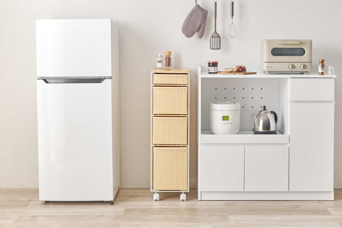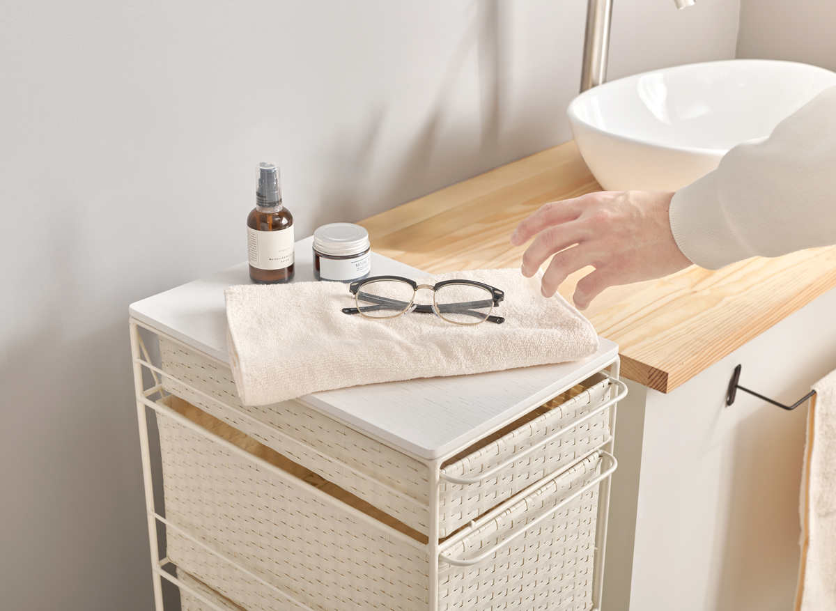 洗面台の横に設置するのにちょうど良い高さ85cmです。朝の身支度に必要な物や、スキンケアグッズなども手に届く所に収納していただけます。