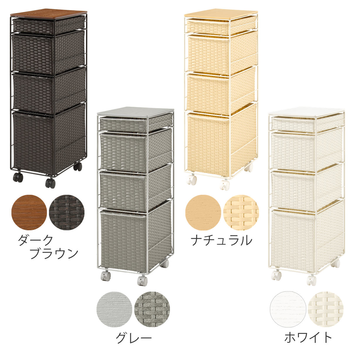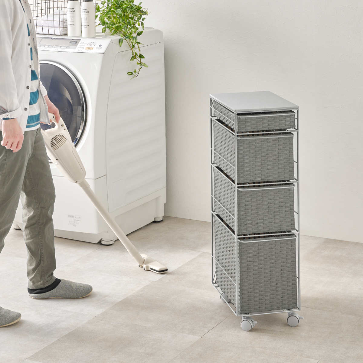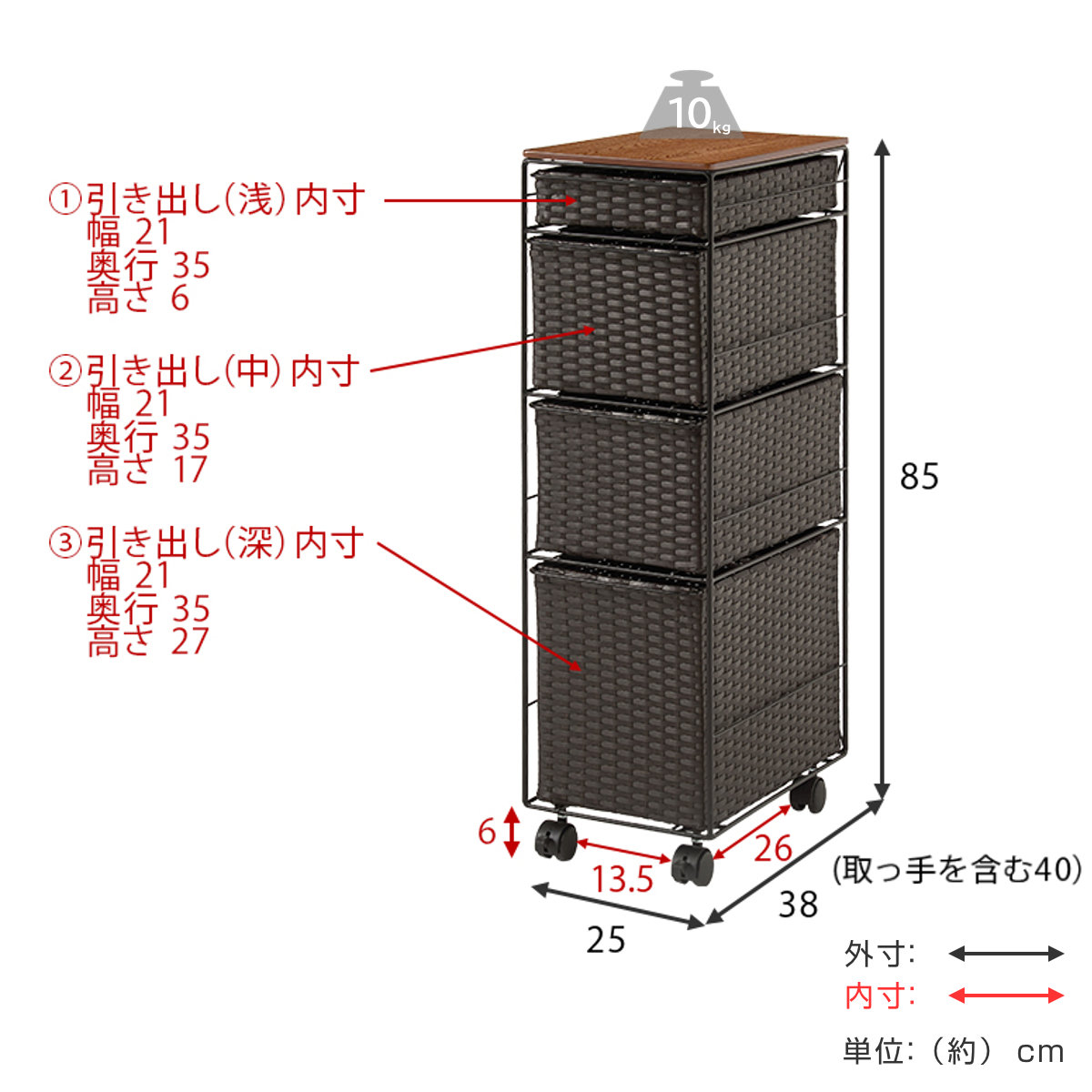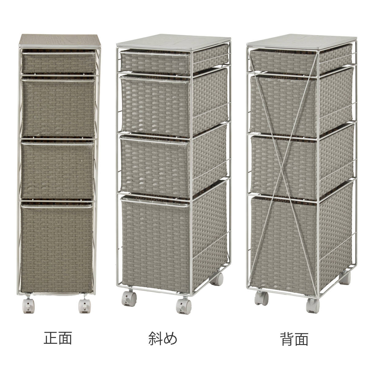 ランドリーチェスト 幅25cm 4段 スリム 引き出し 隙間収納 キャスター付き 木目調天板 スチール ポリエチレン