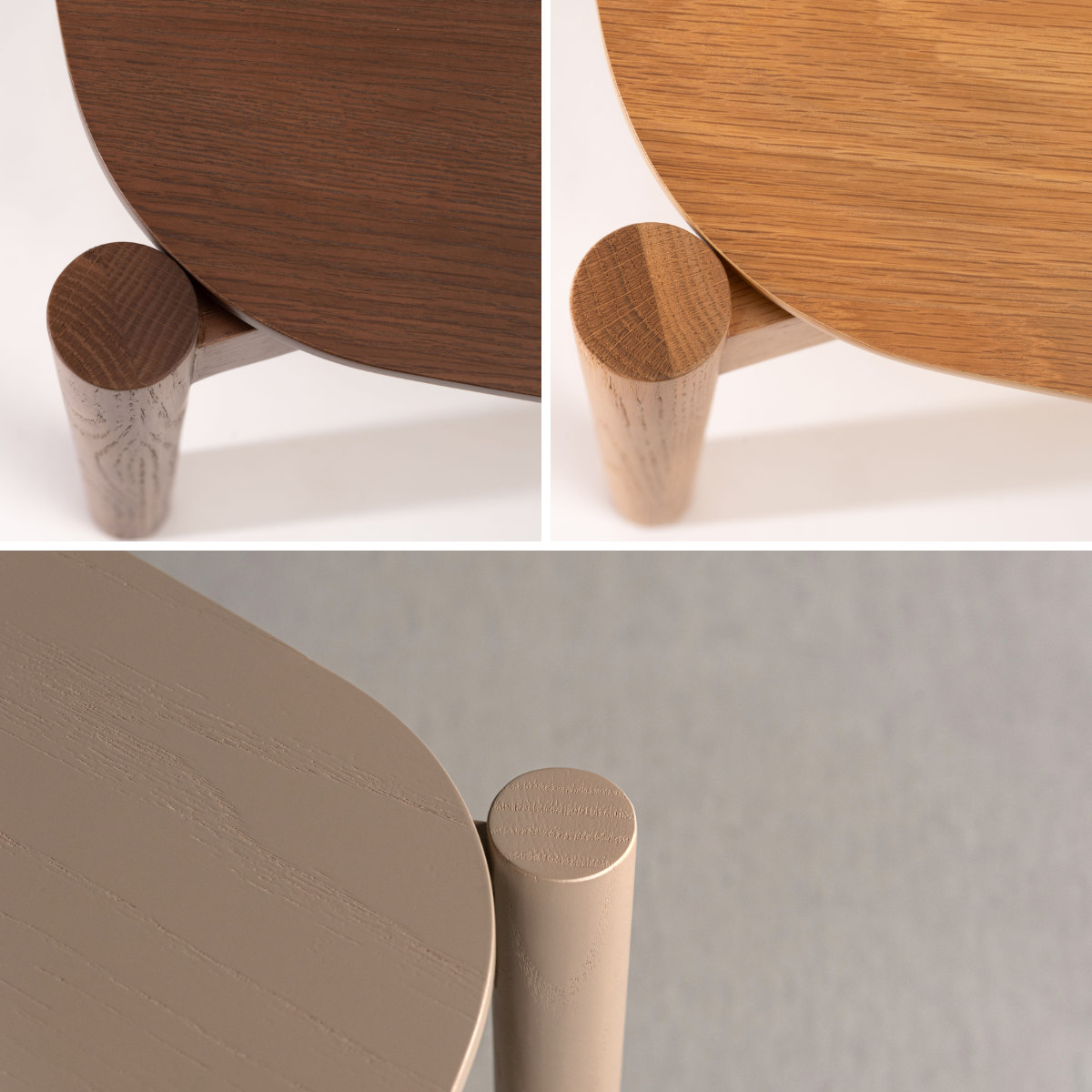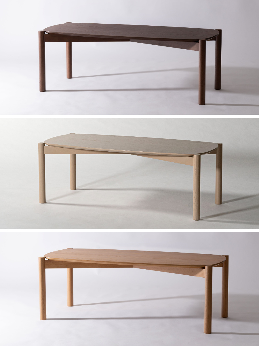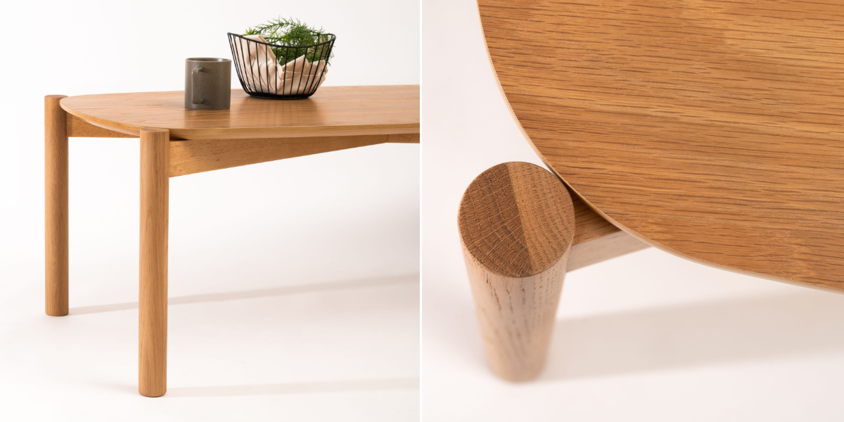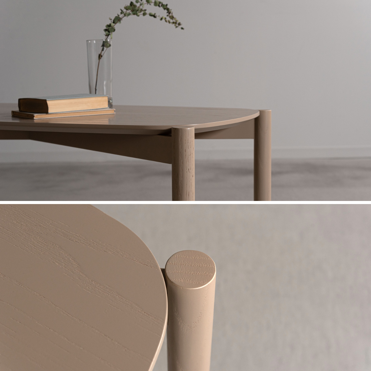 脚部が天板の外側に配置された、少し個性的なデザインになっています。丸みのある天板に合わせて、やさしい印象の丸脚を採用しています。フレームの上に天板をのせたような構造が、他にない表情を生み出します。