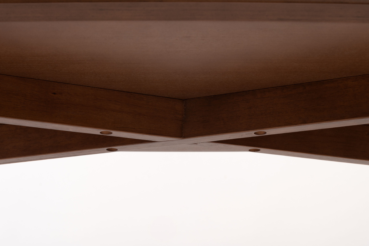 天板下にはクロスした補強板を設け、テーブル全体をしっかりと支える構造です。見た目のすっきりさを保ちながら、安心してお使いいただけます。