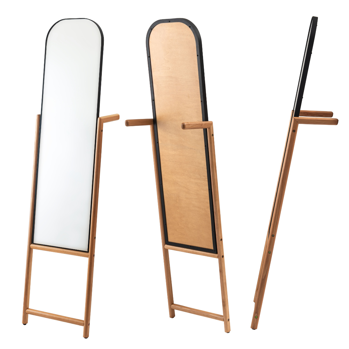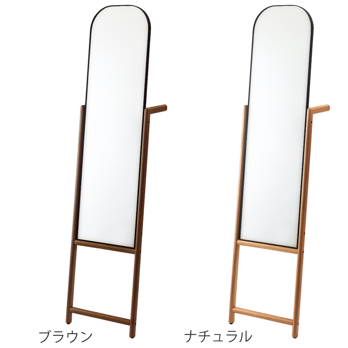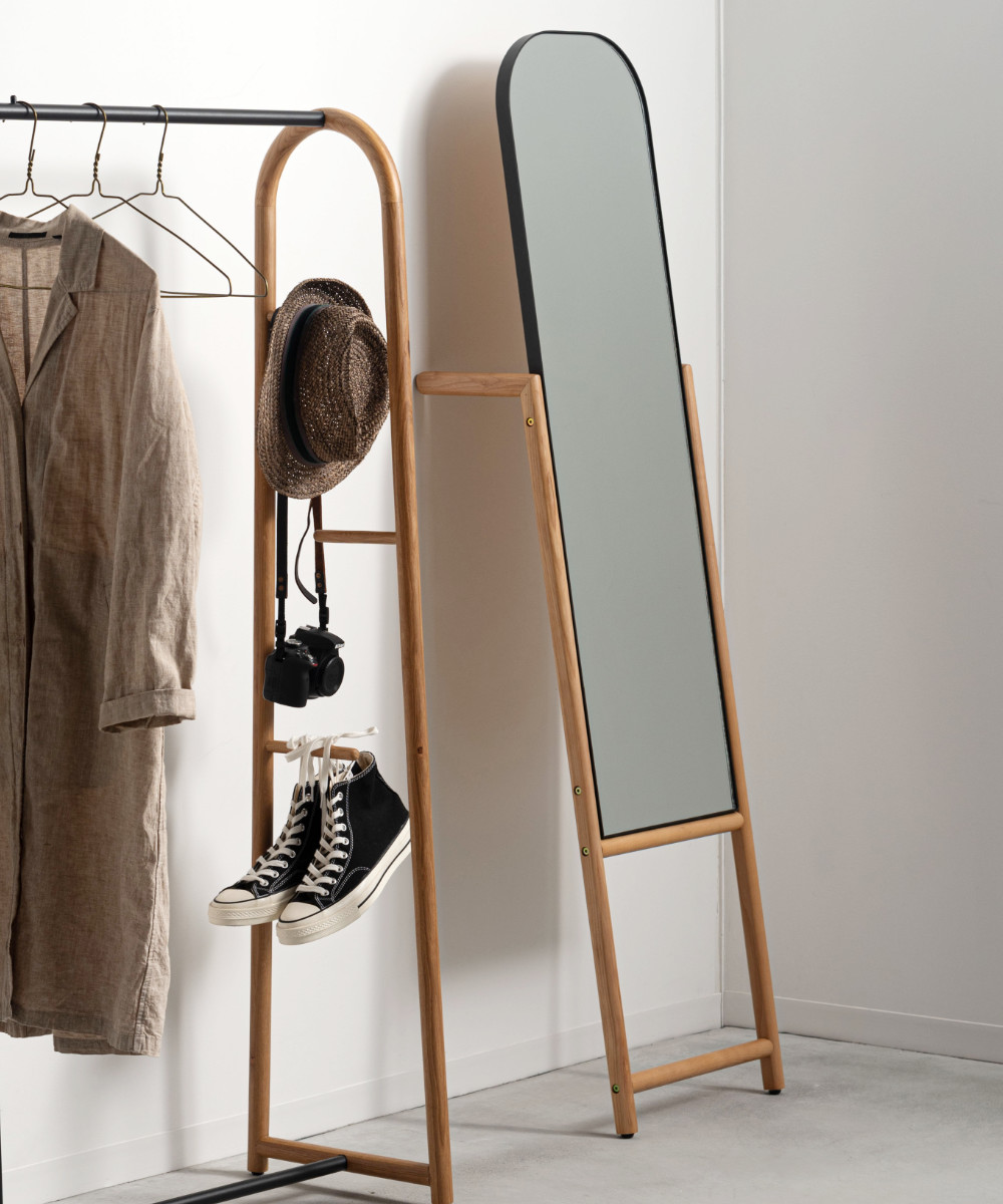 オーク材のフレームと丸みを帯びたフォルムが、空間にあたたかみとやさしい印象を添えるスタンドミラー。木の温もりが感じられるため、お部屋に自然となじみ、置くだけで落ち着いた雰囲気を演出できます。
