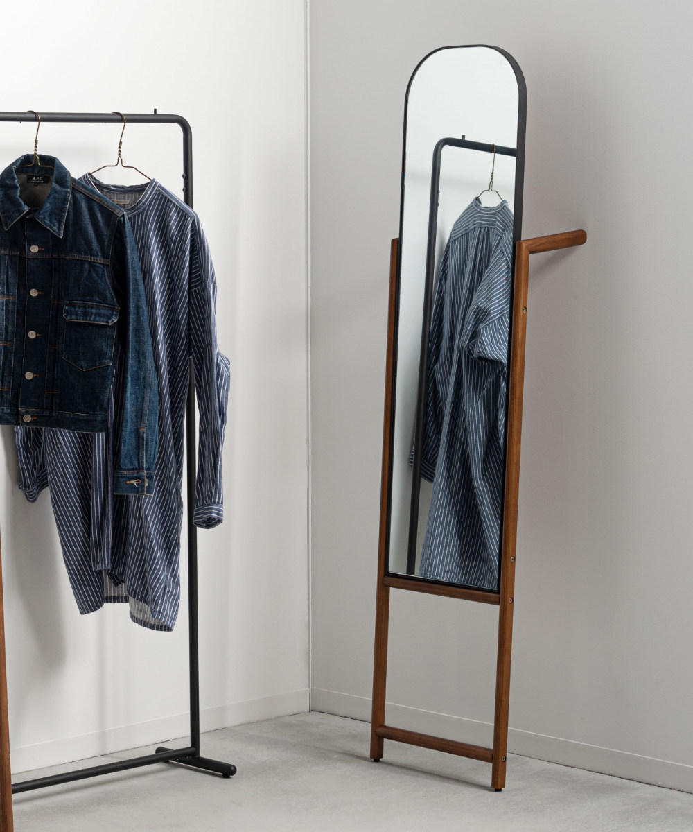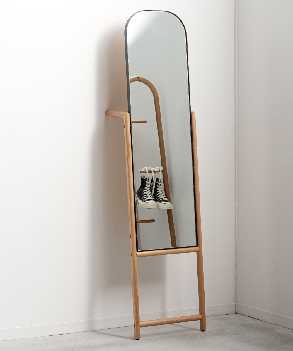 立て掛け部分にはハンガーなどを掛けられる仕様を取り入れ、身支度をサポートする実用的なデザインに。服やバッグを手元にまとめられるため、外出前の準備がスムーズに行えます。