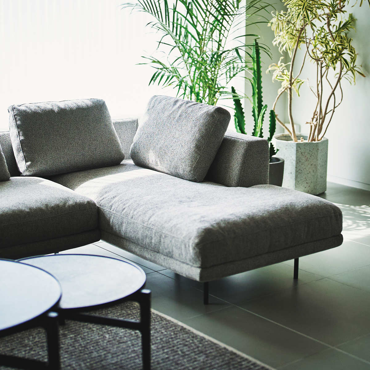 洗練されたフォルムが印象的なカウチソファです。空間に置くだけで、モダンで上質な雰囲気を演出します。