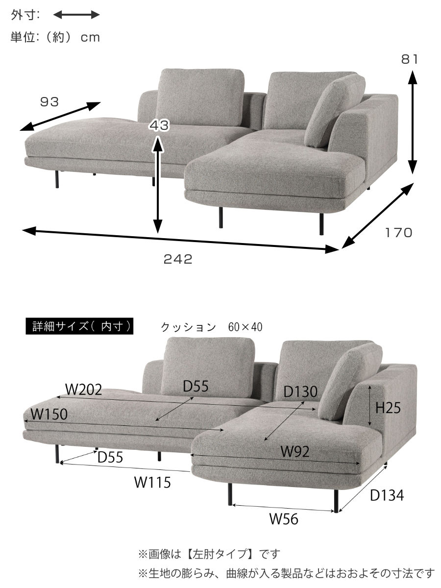 | サイズ | 約 幅242×奥行93×高さ81(cm) 座面高:約 43(cm) カウチ:奥行170cm |