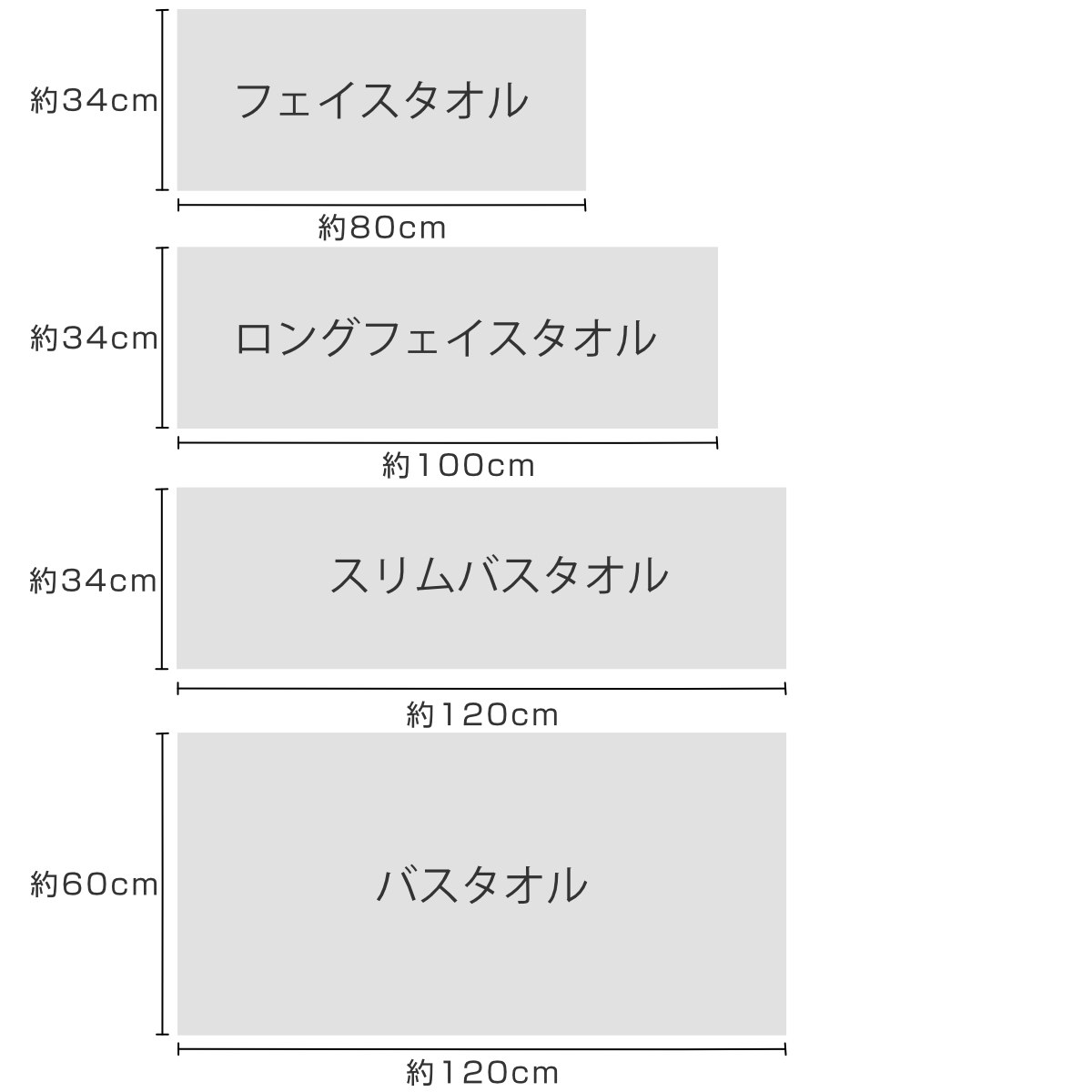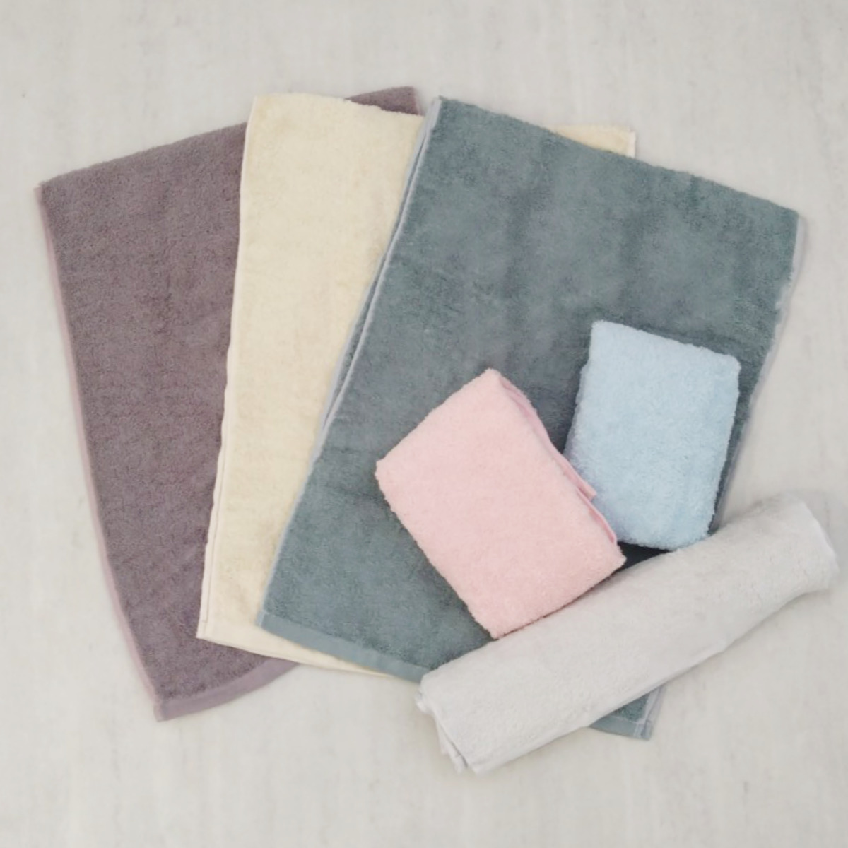 バスタオル、スリムバスタオル、ロングフェイスタオル、フェイスタオルの4サイズをご用意しています。用途に合わせてお選びいただけます。