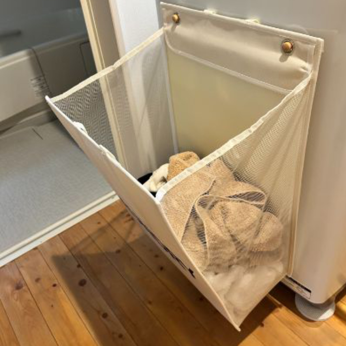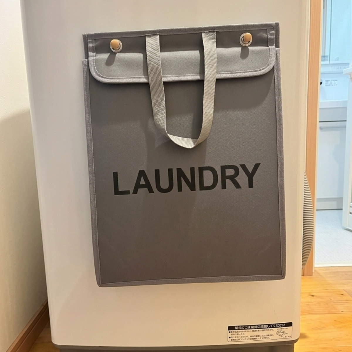 洗濯機横や壁に掛けて使用できる、省スペース設計のランドリーバッグです。付属の木製フック+粘着シールで、取り付けもカンタン。洗濯物を入れたまま「掛けておける」ので、床置きのカゴよりスペースを取りません。